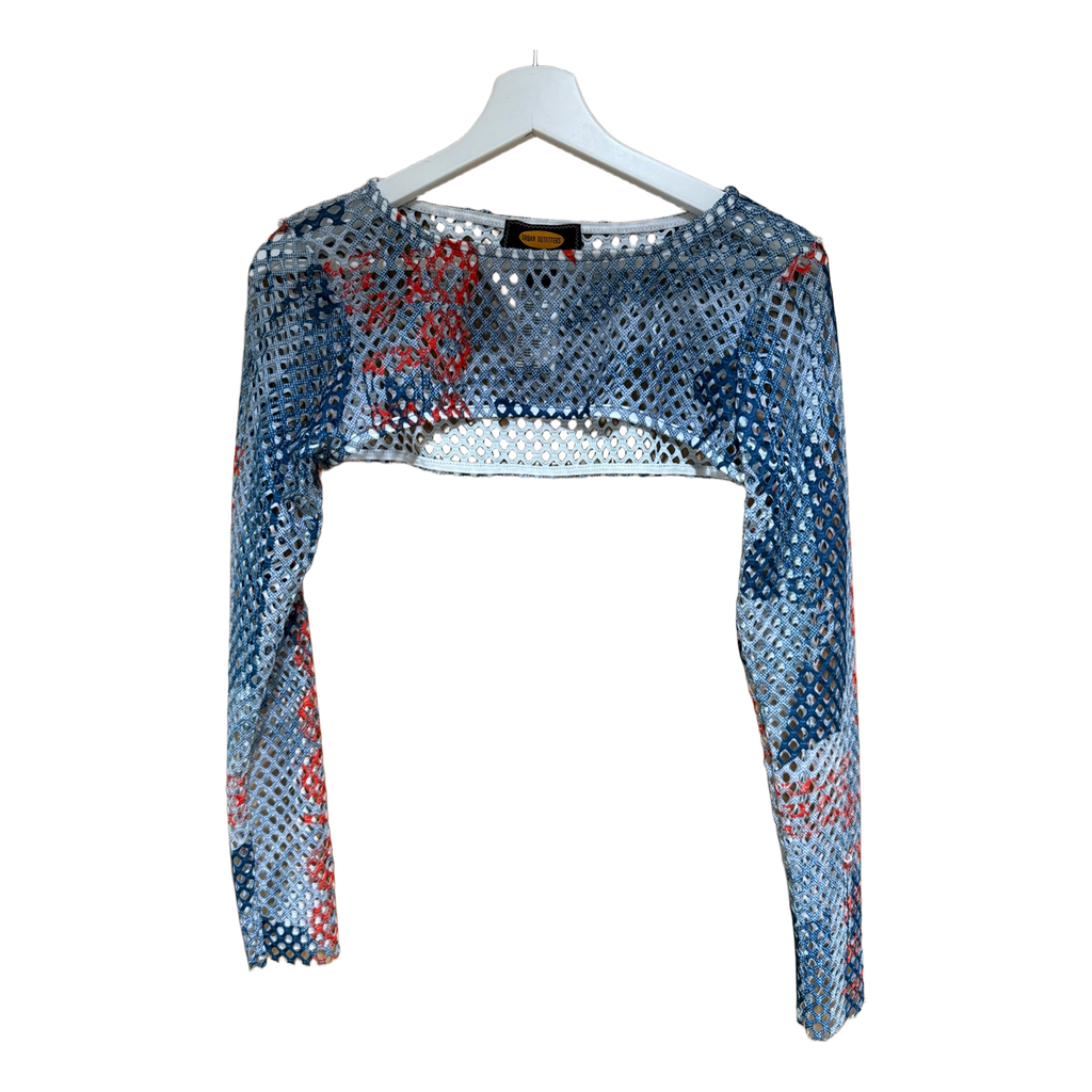 Long sleeve mesh shrug with a multicolor print. Cropped style with an open front.