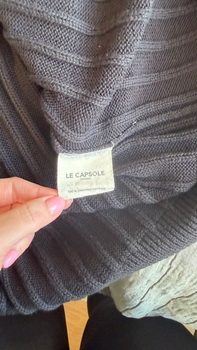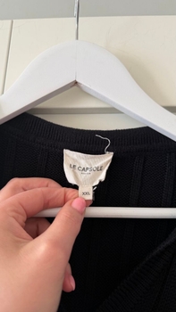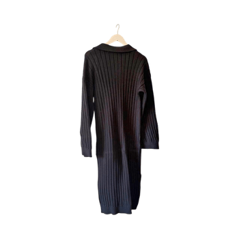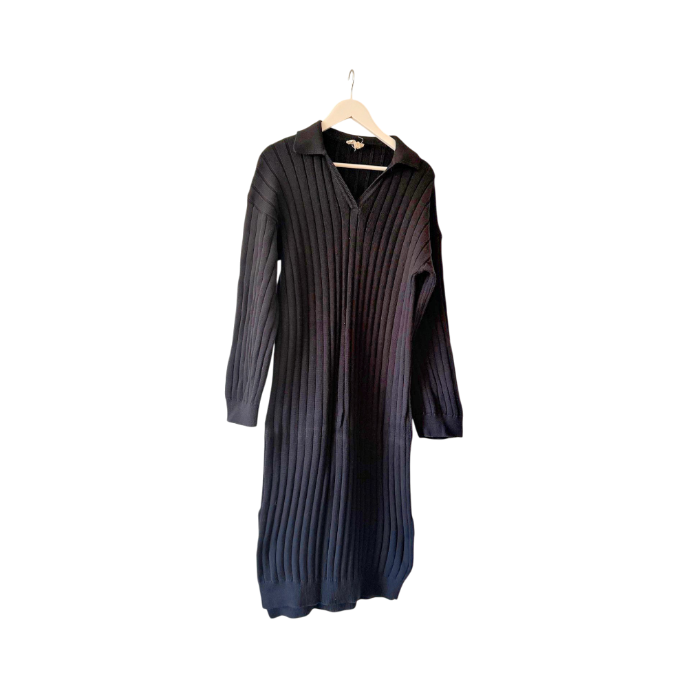 Black rib knit dress, with a collar and V-neckline. Made of 100% organic cotton. There is a slit at the hem. Size XXL.