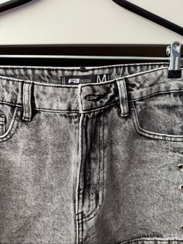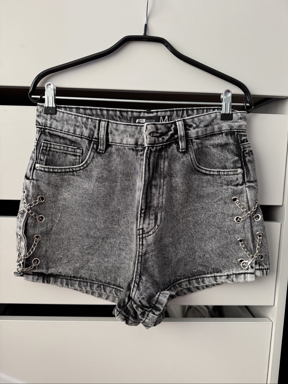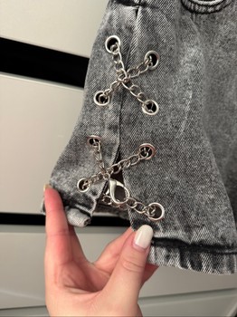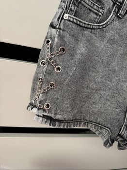 Grey denim shorts with decorative chains on the sides. Size M. Button missing.