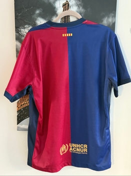 Red and blue football jersey featuring the FC Barcelona crest and Nike logo. It has 'T.S. 1989' in gold text and the UNHCR logo on the back.