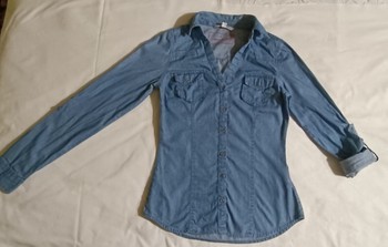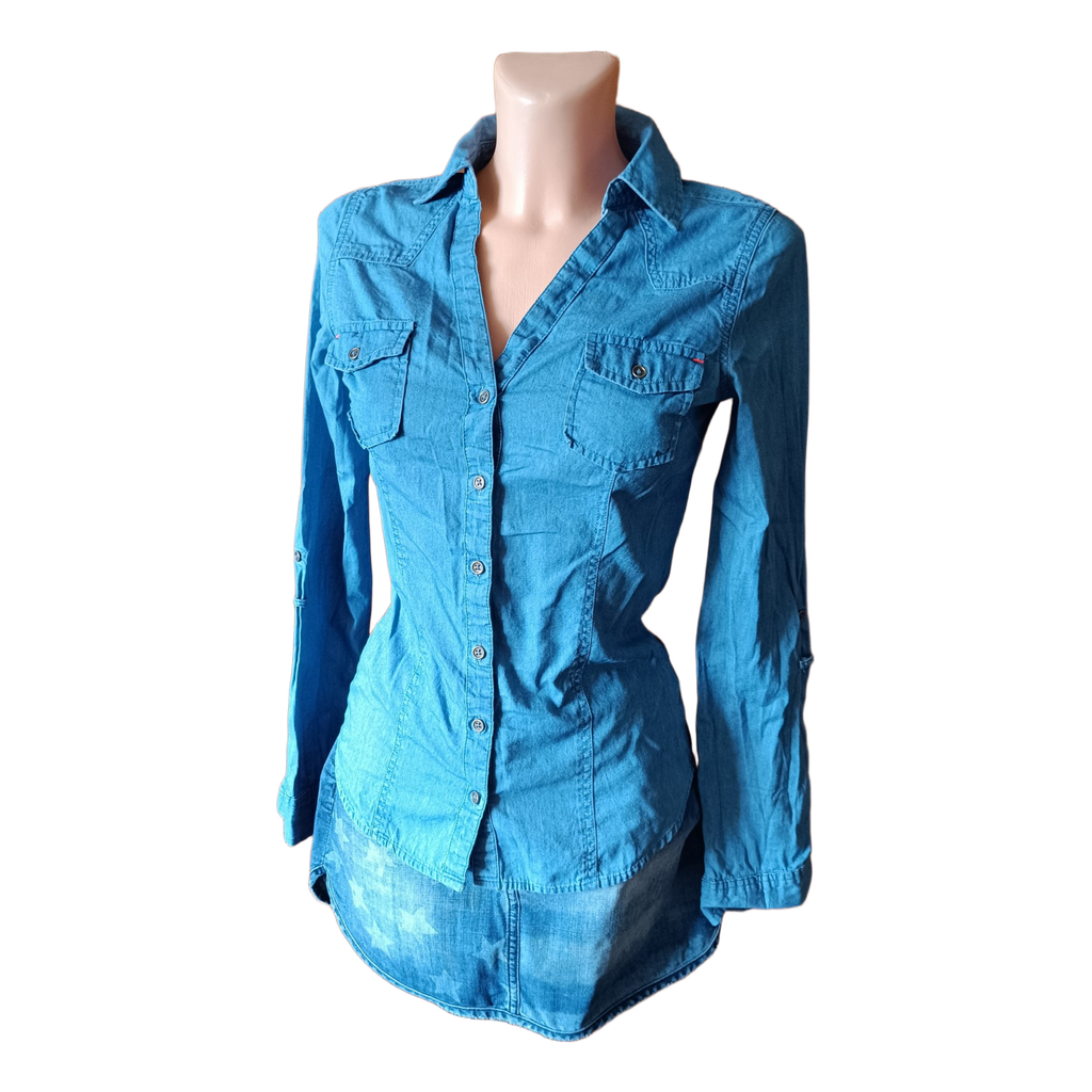 Blue button-down shirt with two chest pockets. Made of 100% cotton. Size 34.