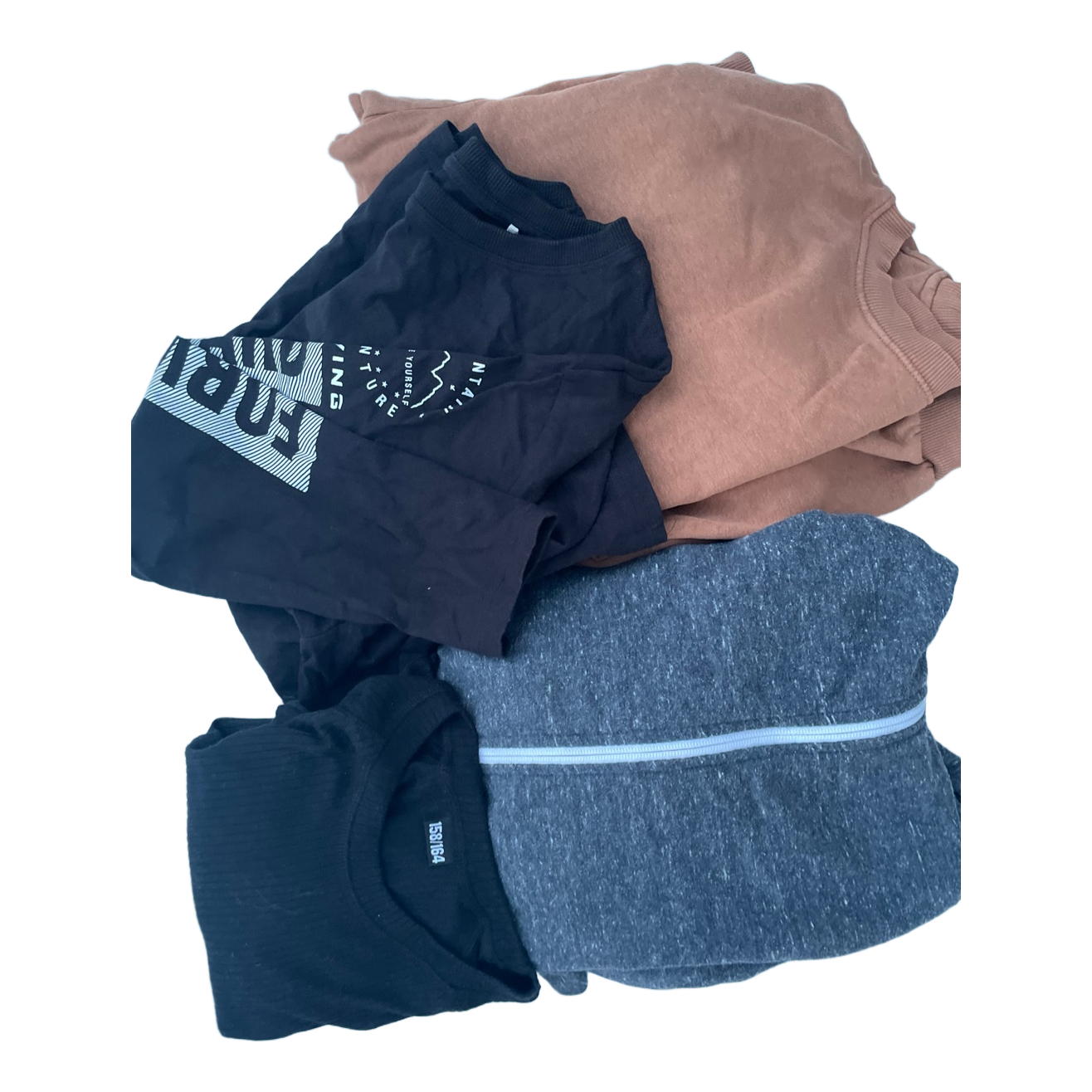 Brands Guppy, Stadium, H&M. Another black shirt is a base layer shirt. Clothes otherwise size 158-164. Black hoodie is size 170 cm. Have been in a cat household.