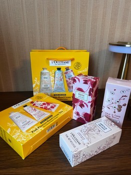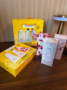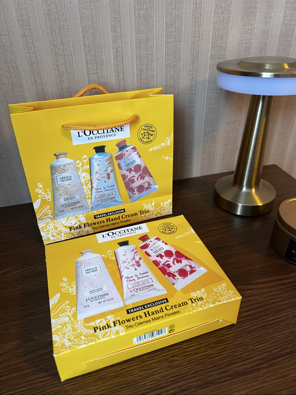 L'Occitane travel exclusive hand cream trio with gift bag and individual cream boxes. Includes Rose, Cherry Blossom, and Neroli & Orchidee scents.
