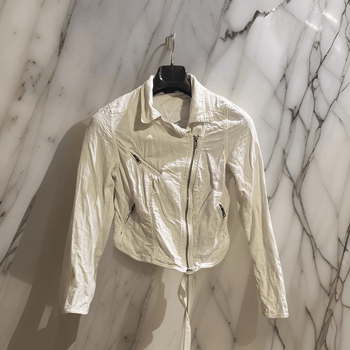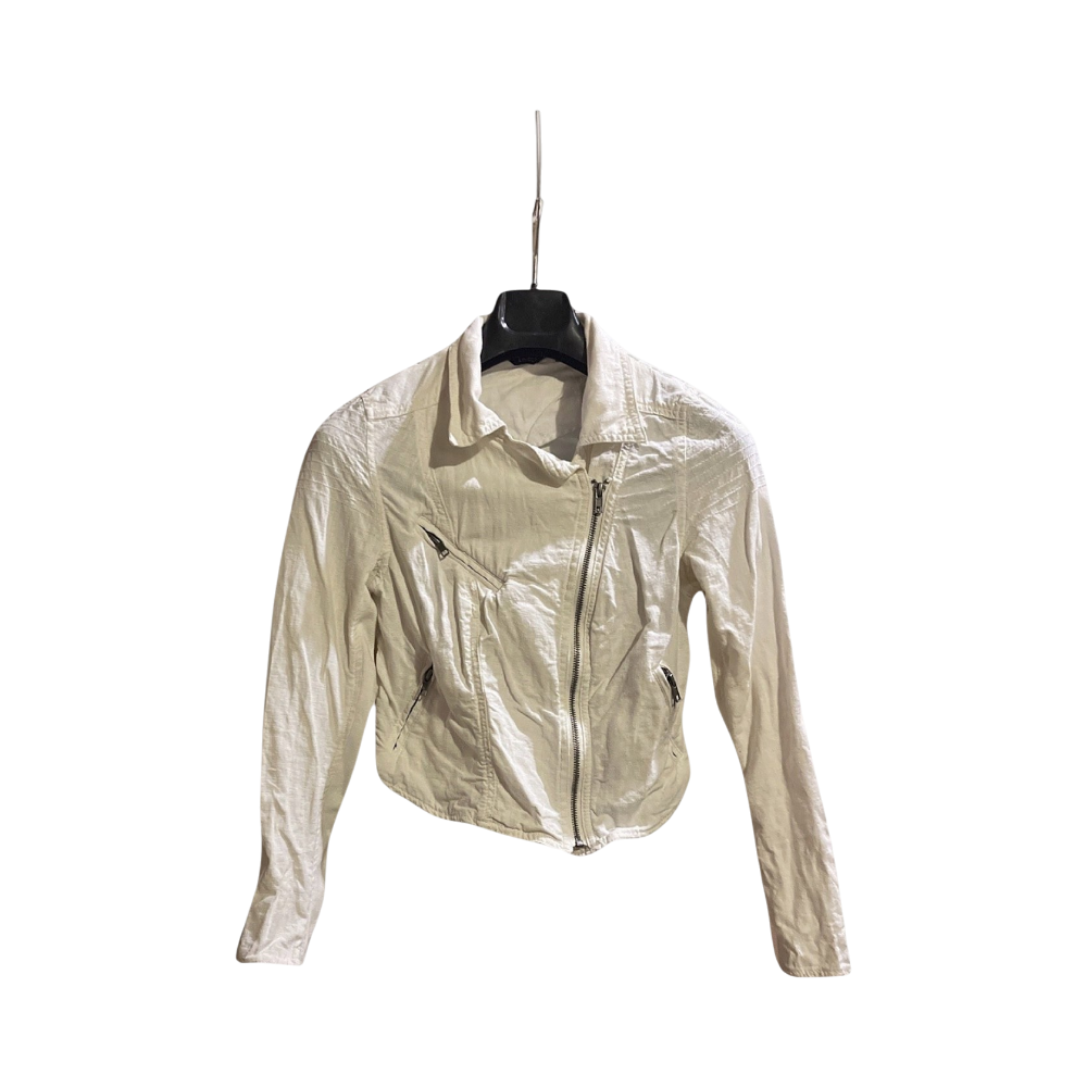 Cropped linen jacket featuring a white color with zip closure and multiple zip pockets. Includes a slightly crinkled texture and a fitted design.