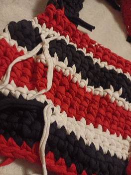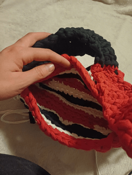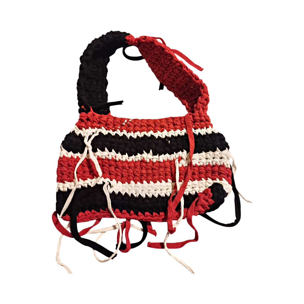Woven handbag with red, black and white stripes. Can be used daily. Manufacturing material is not visible.