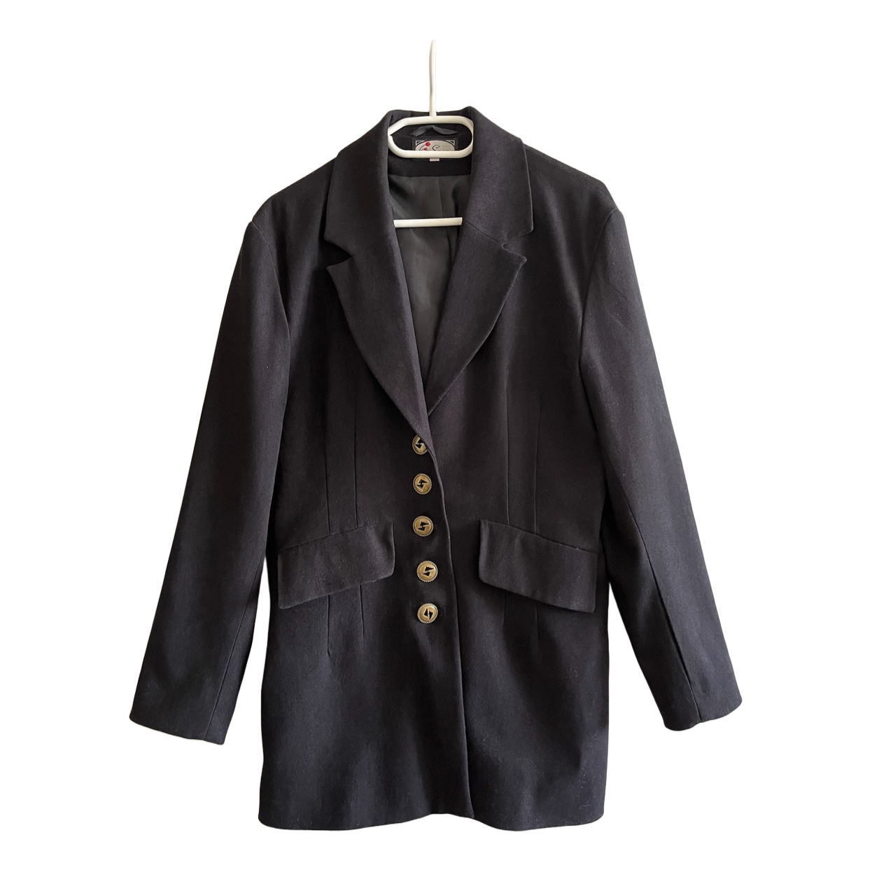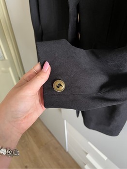 Black blazer with gold-toned buttons and flap pockets. Size 38.