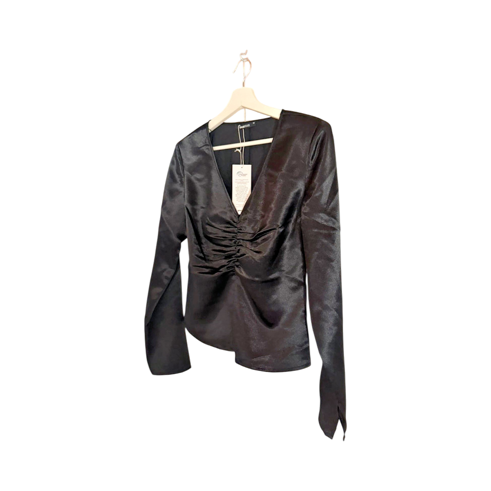 Used black shirt, size 36, made from recycled polyester. V-neckline and gathered detail at the front.