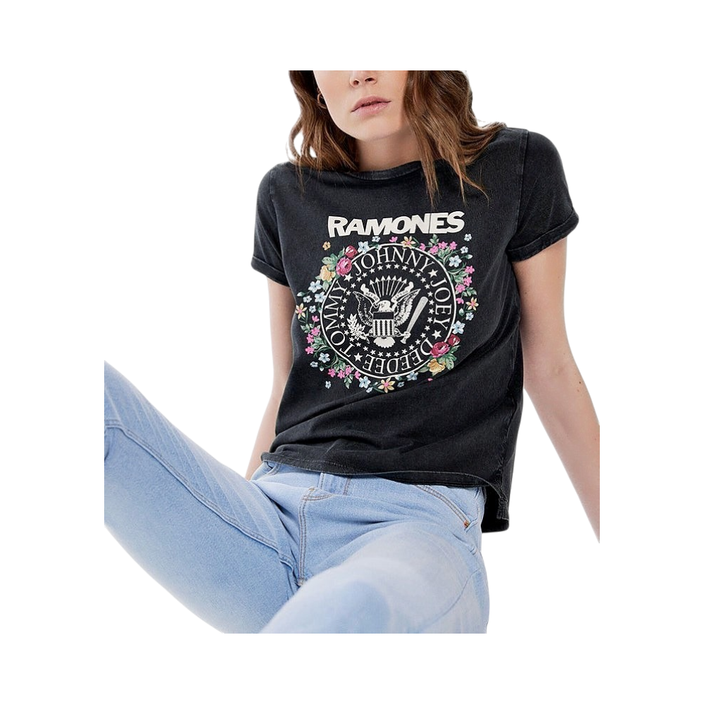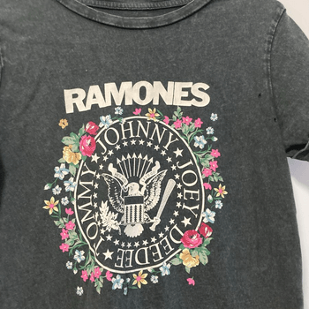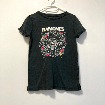 Keywords: band t-shirt, Ramones tee, washed black, grey tee, grunge style, rock shirt, graphic tee, casual, normcore, festival look, vintage-inspired