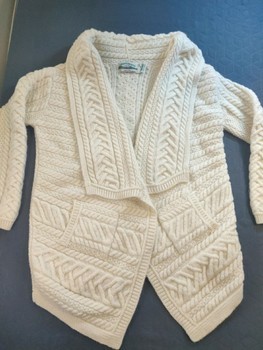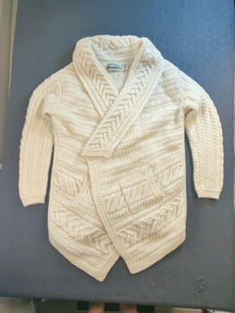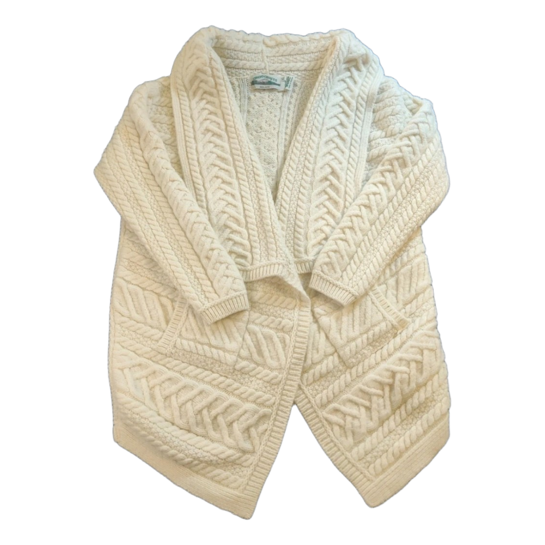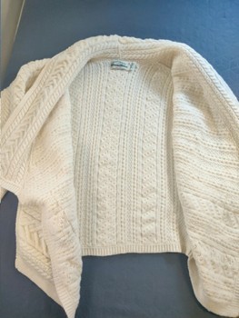 Warm and beautiful cable-knit wool cardigan (open and wrap style). Color is natural off-white.