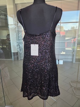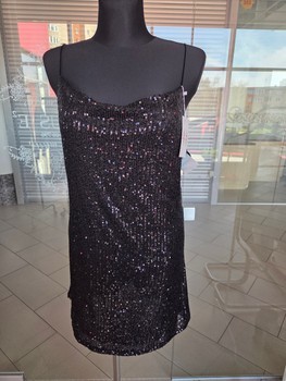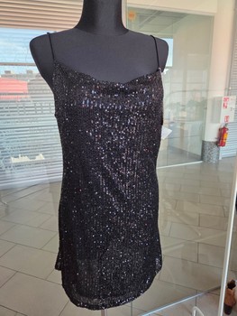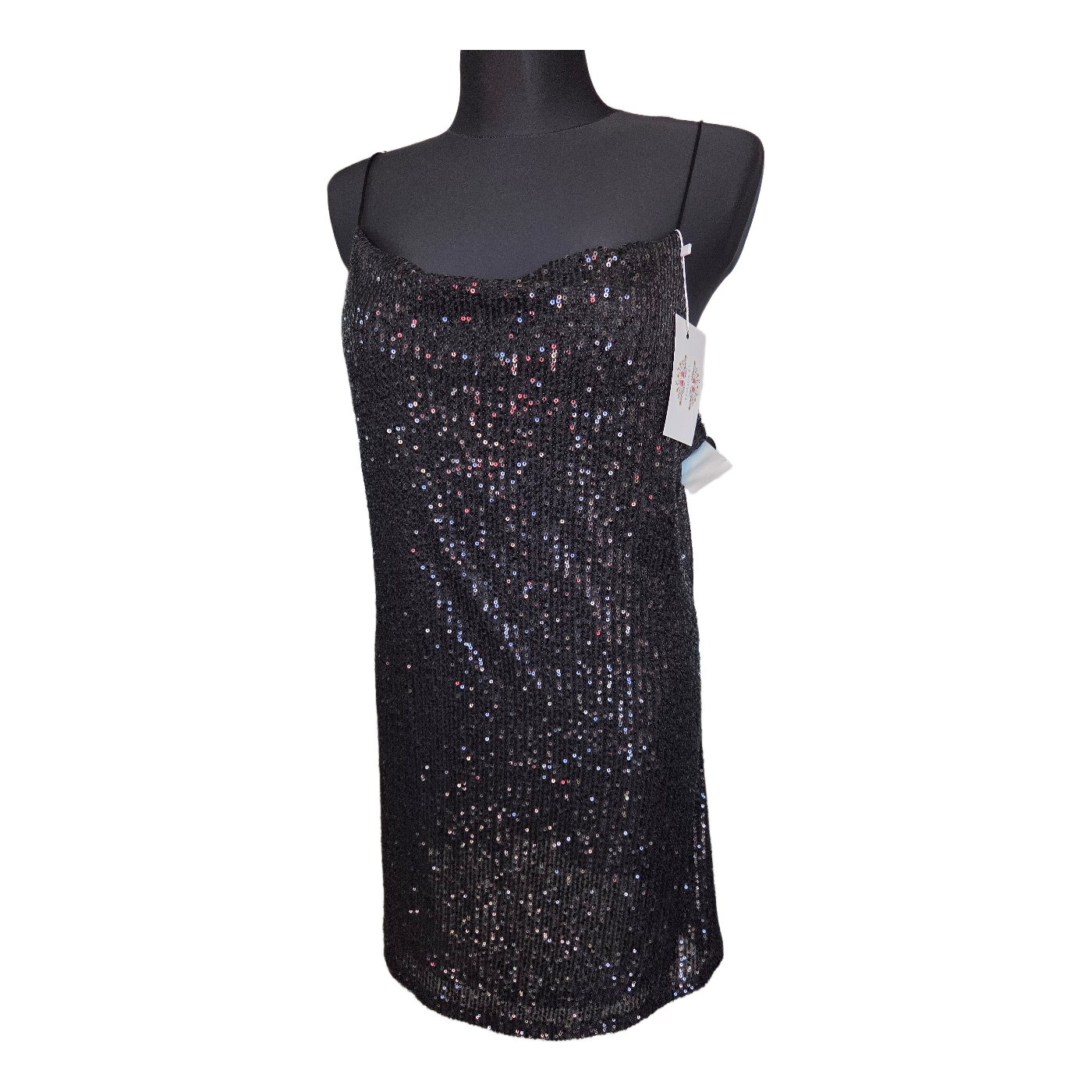 Black sequin dress with thin straps and a cowl neckline. New with tags. Size M.