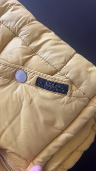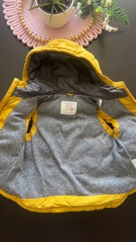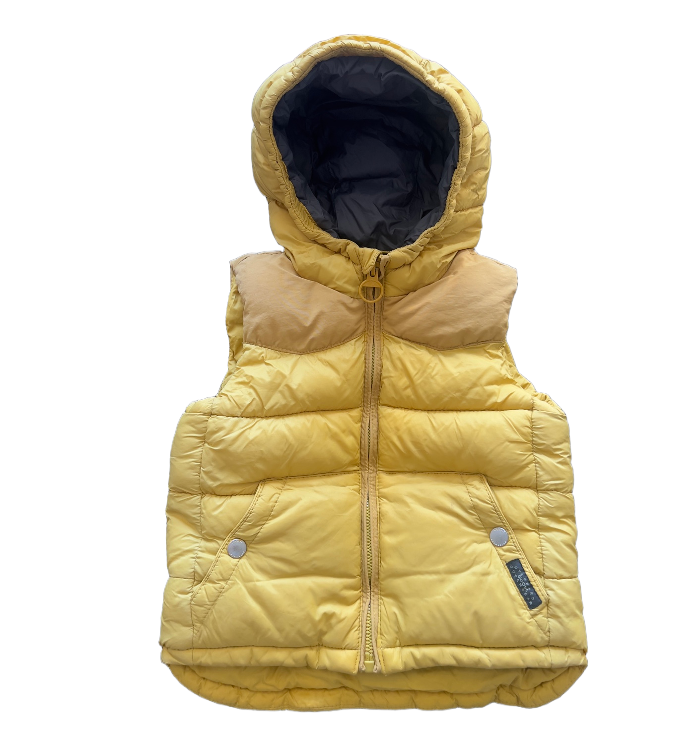 Yellow hooded puffer vest with a grey lining. Features a front zip closure, two front pockets, and a label tag. Size 86.