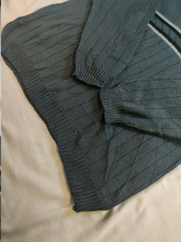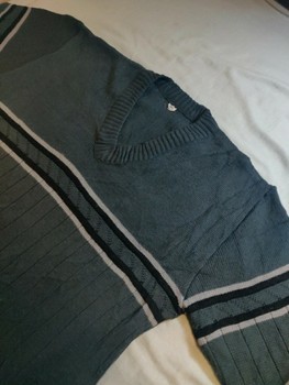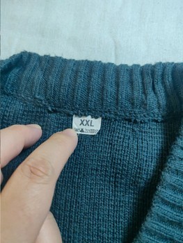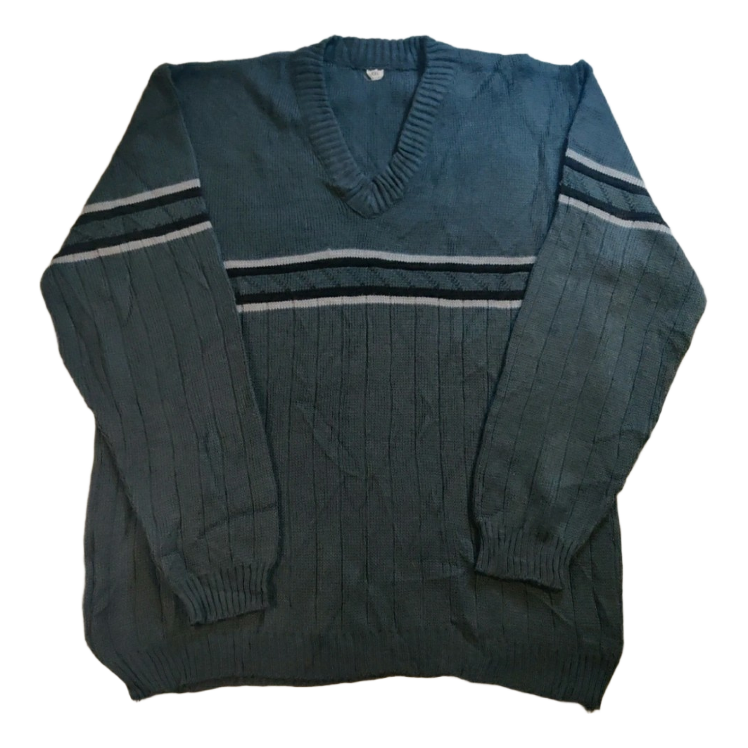 Men's grey/blue V-neck sweater with retro touch. Lightweight knit (probably acrylic). Good used condition. The surface has slight pilling and the knit is slightly wrinkled from storage. No holes or stains. No brand or material tags. The label says XXL, but corresponds better to men's size L or a narrow XL. See measurements. Pit to pit: 57 cm Shoulder to hem: 72 cm Pit to cuff: 50 cm