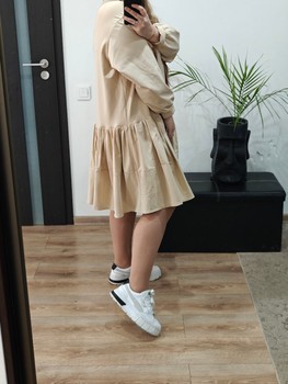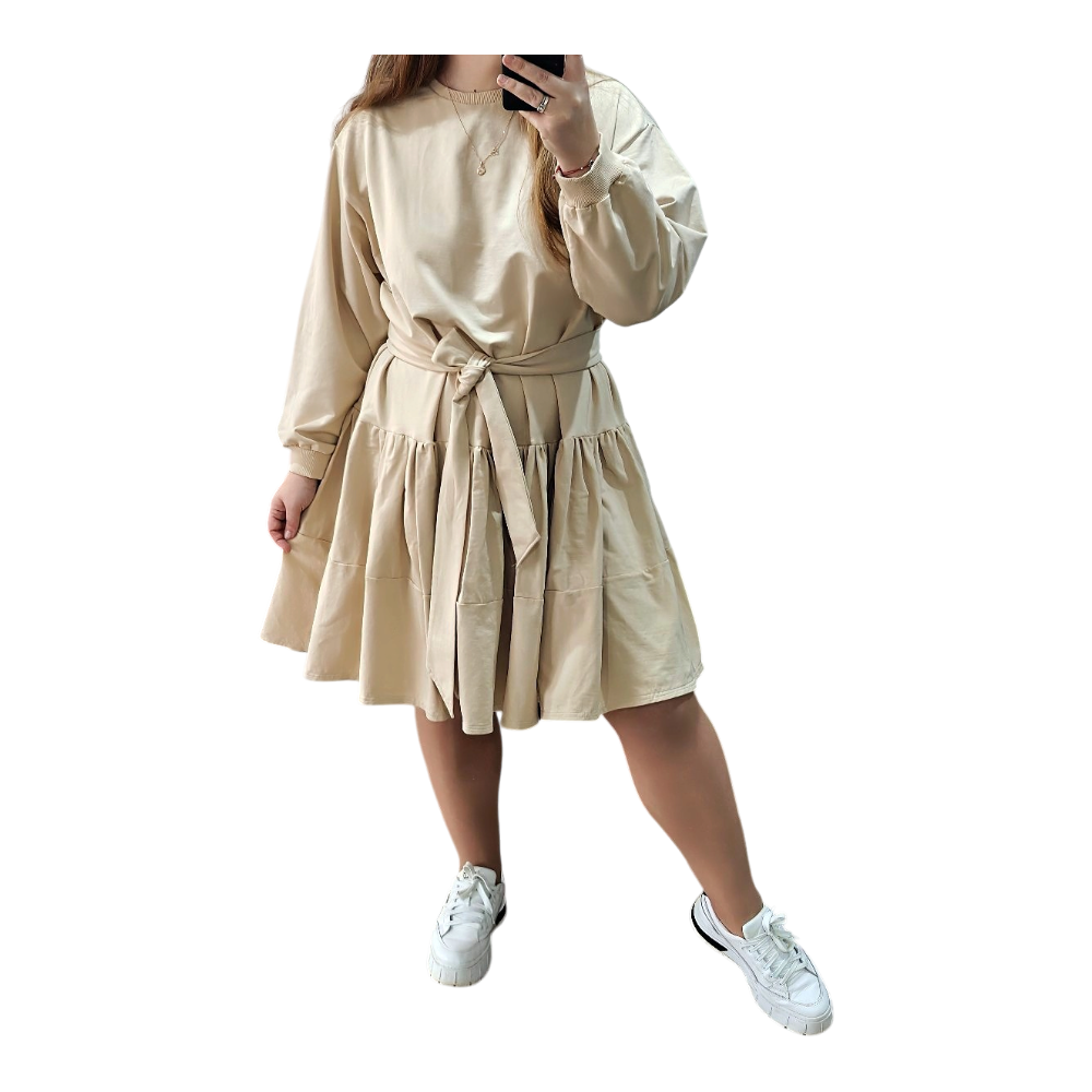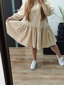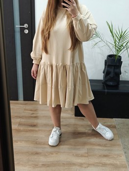 Sand-colored knitted dress with long sleeves. I sewed the dress myself; the sand-colored belt in the photo turned out a bit off, I still don't know how to finish the ends 😁 The black belt is not included. The dress has a lot of fabric at the hem, so it drapes very nicely. 94% cotton and 6% elastane. Photographed on XXL. The dress has not been worn; I only, after sewing it, put it to wash. Length: 104 cm. Under the arms: 136 cm. Waist: 132 cm.