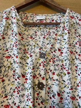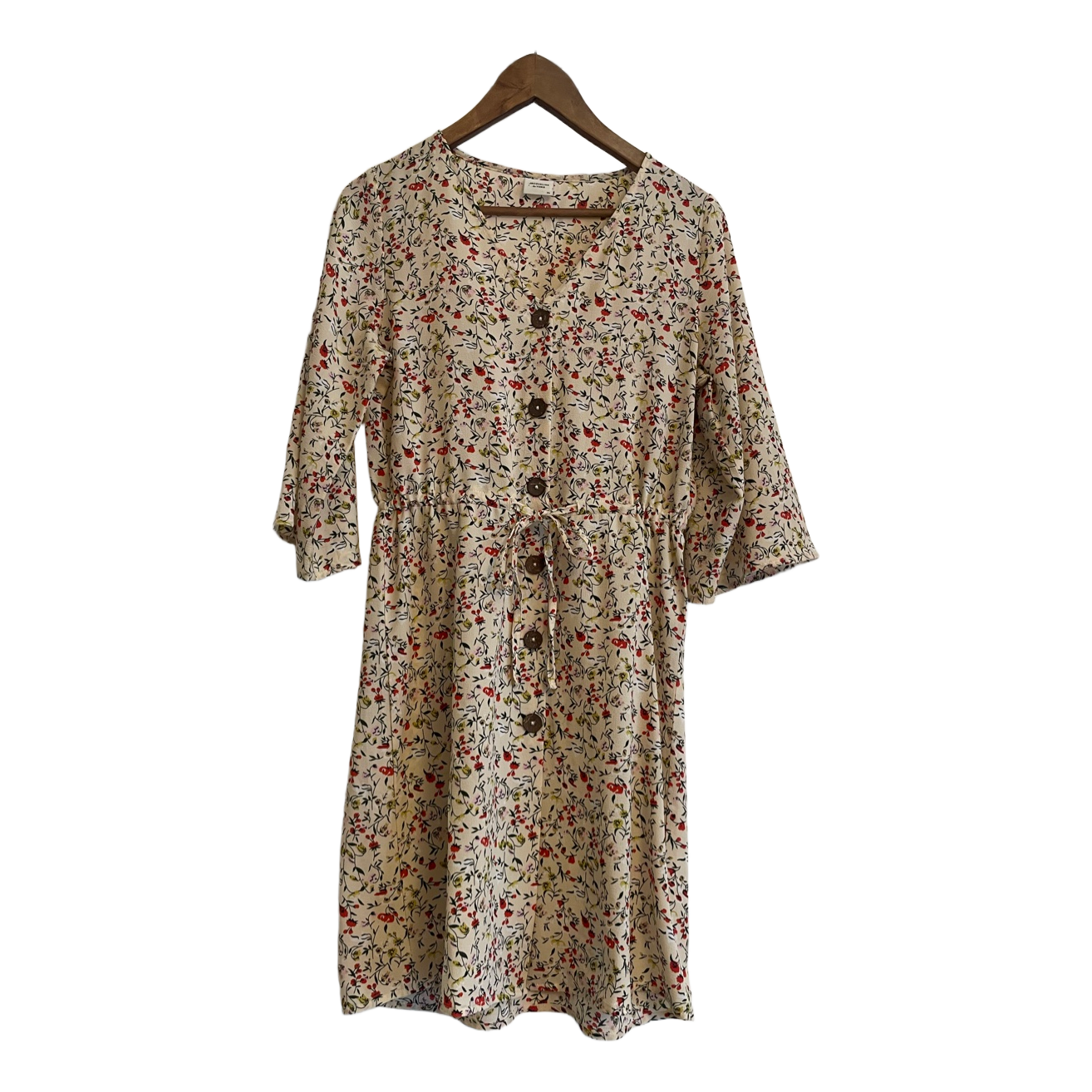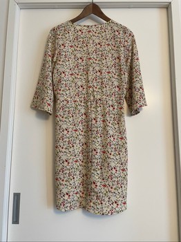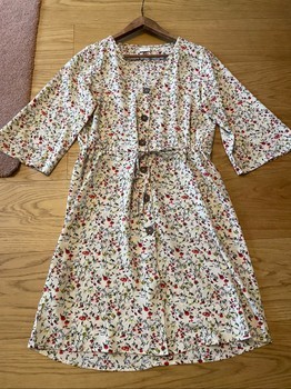 Flower-patterned dress with buttoning at the front and waist tie. Size 34.