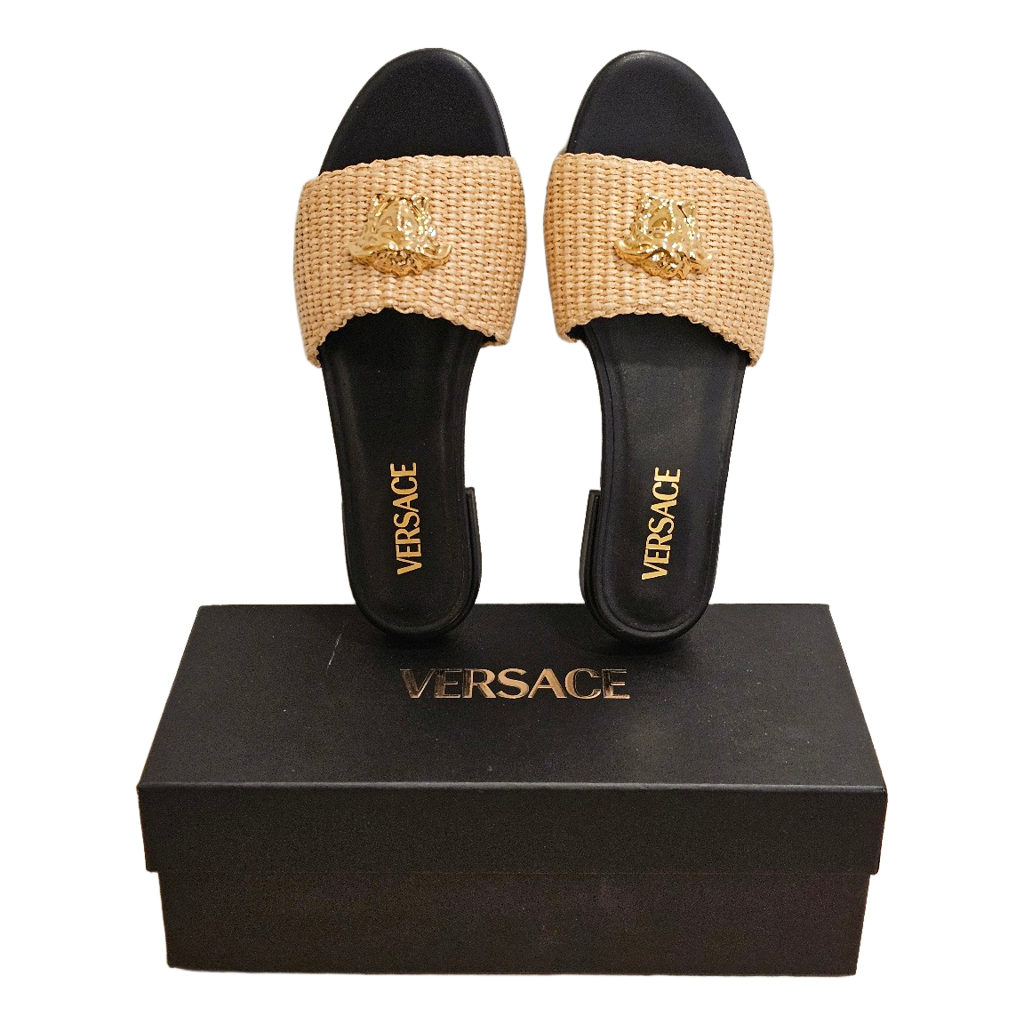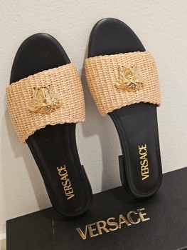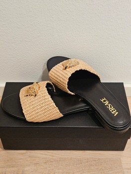 Beige-colored braided Versace sandals with a gold detail. Includes dust bag and original box.