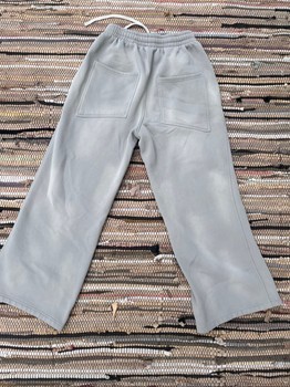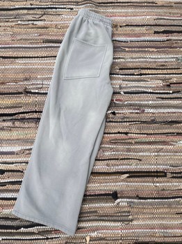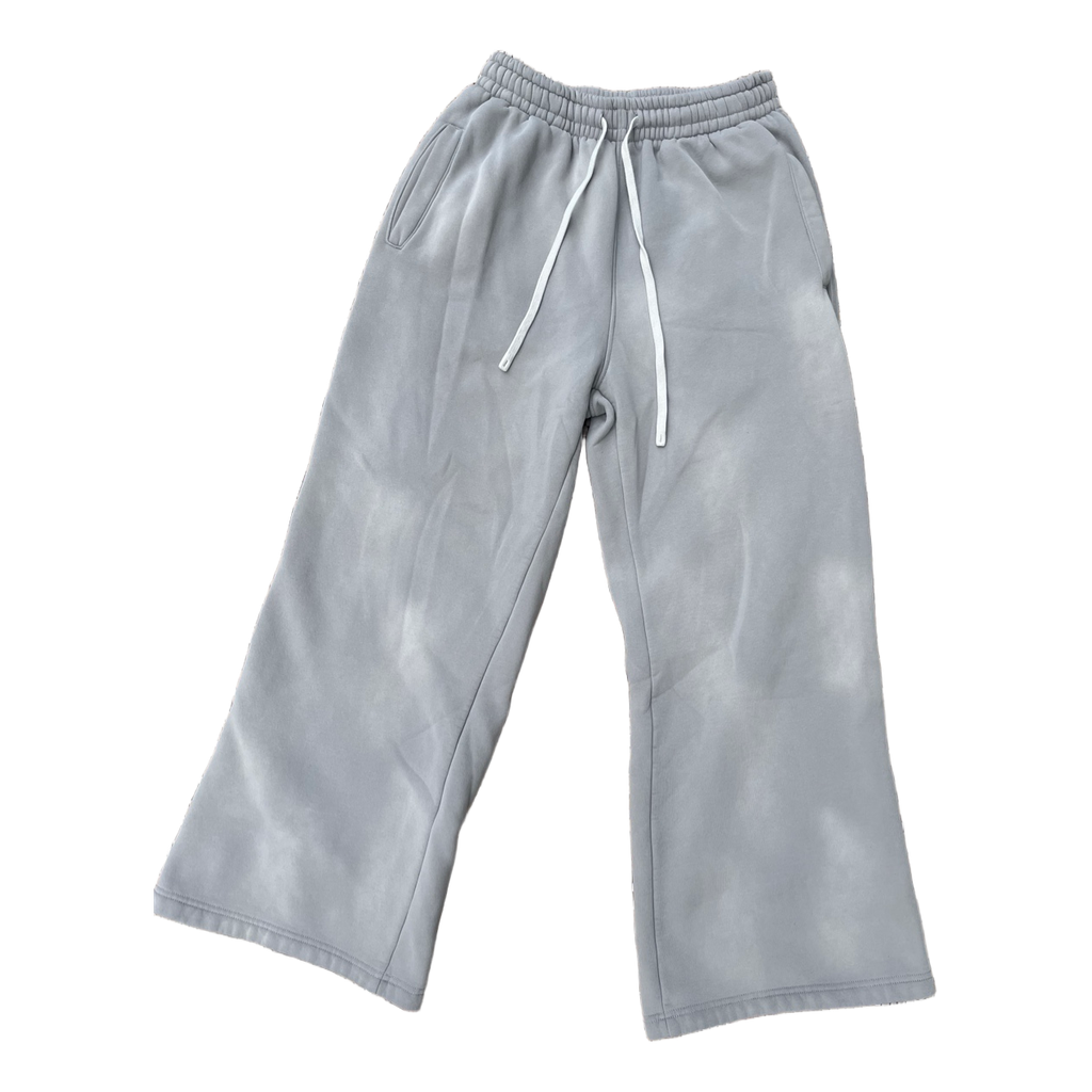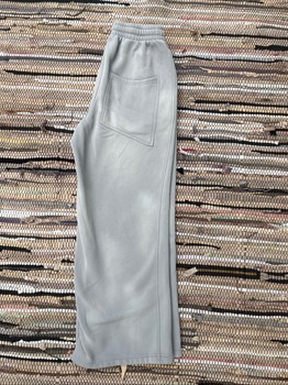 Grey sweatpants with a comfortable elastic waistband and drawstring. Features two back pockets.