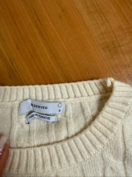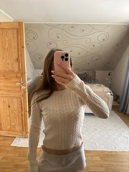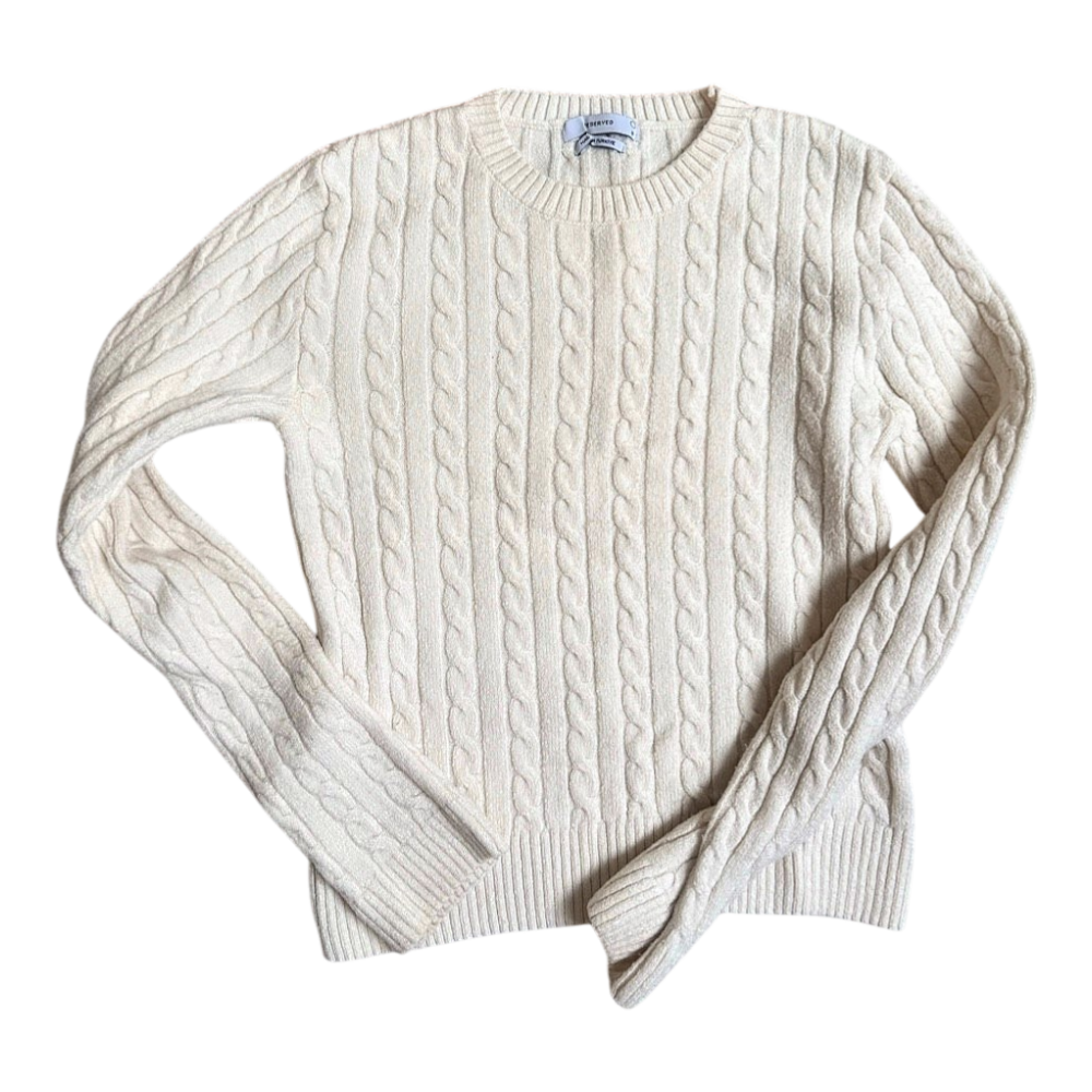 Cream cable knit jumper with a round neckline. Long sleeves with ribbed cuffs.