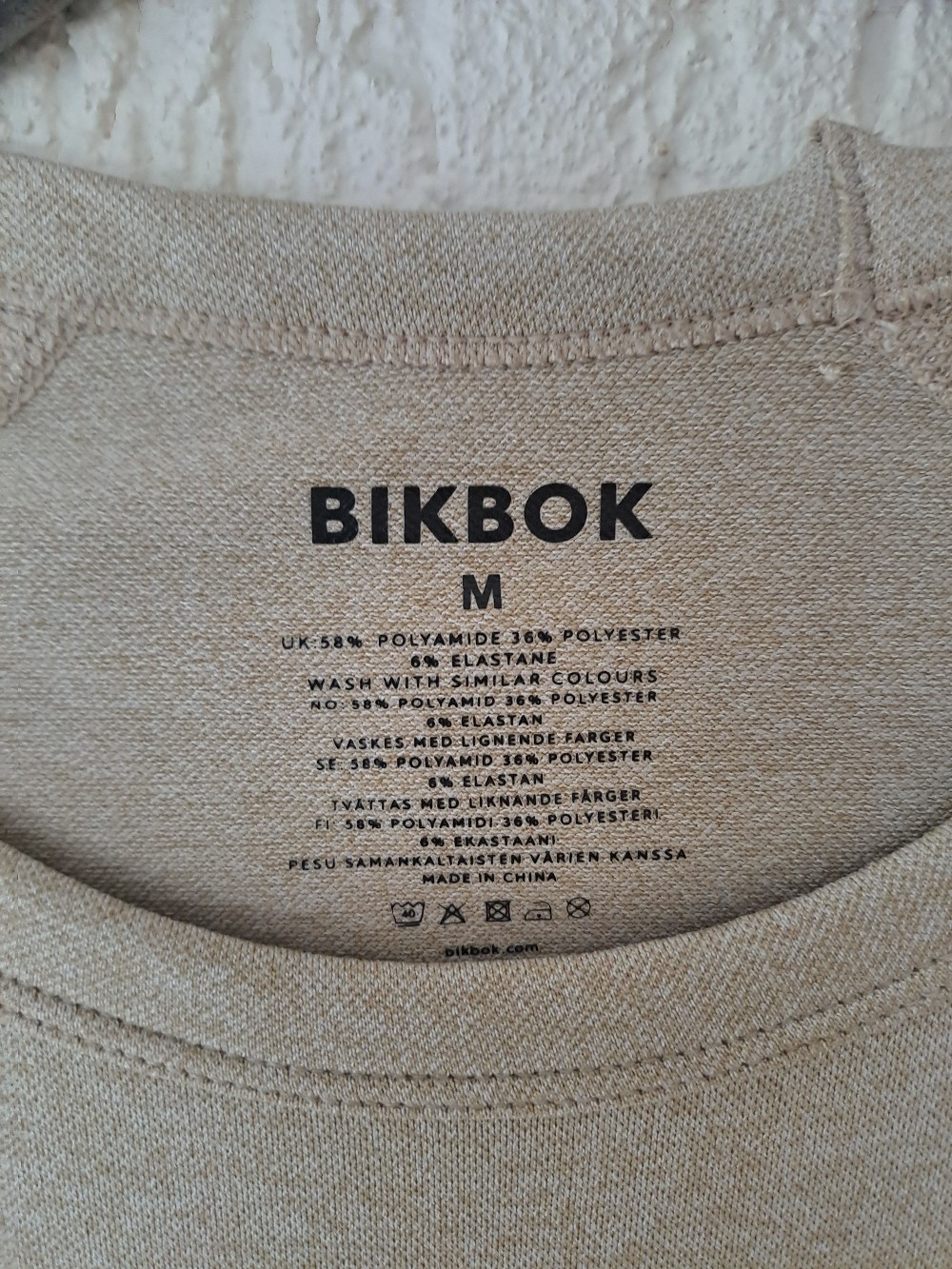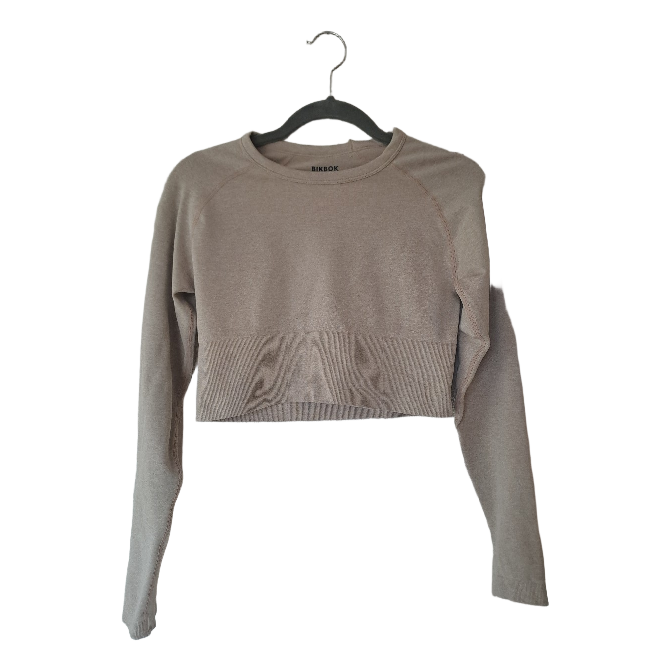 Beige long-sleeved cropped top with a ribbed hem. Made from a blend of polyamide, polyester, and elastane. Size M.