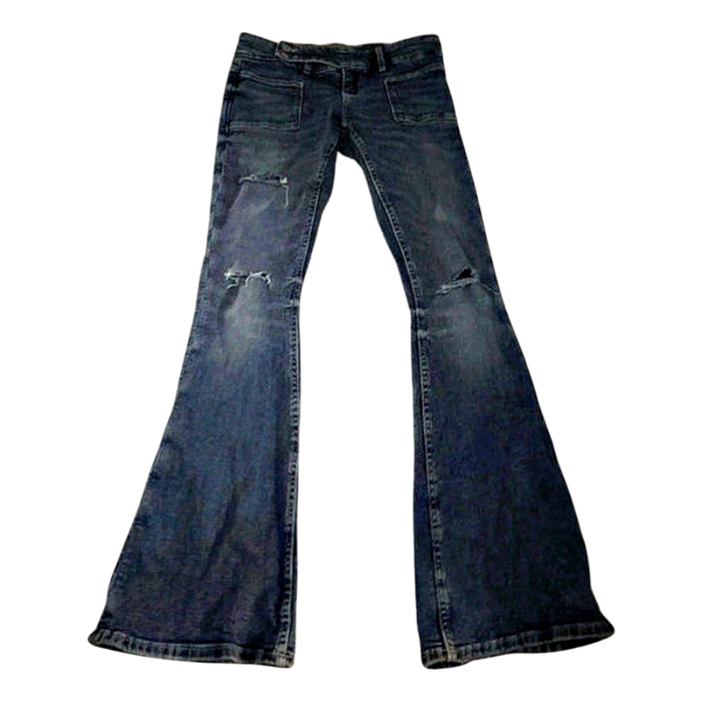 Blue flare jeans, ripped at the knees.