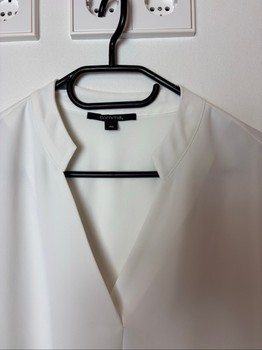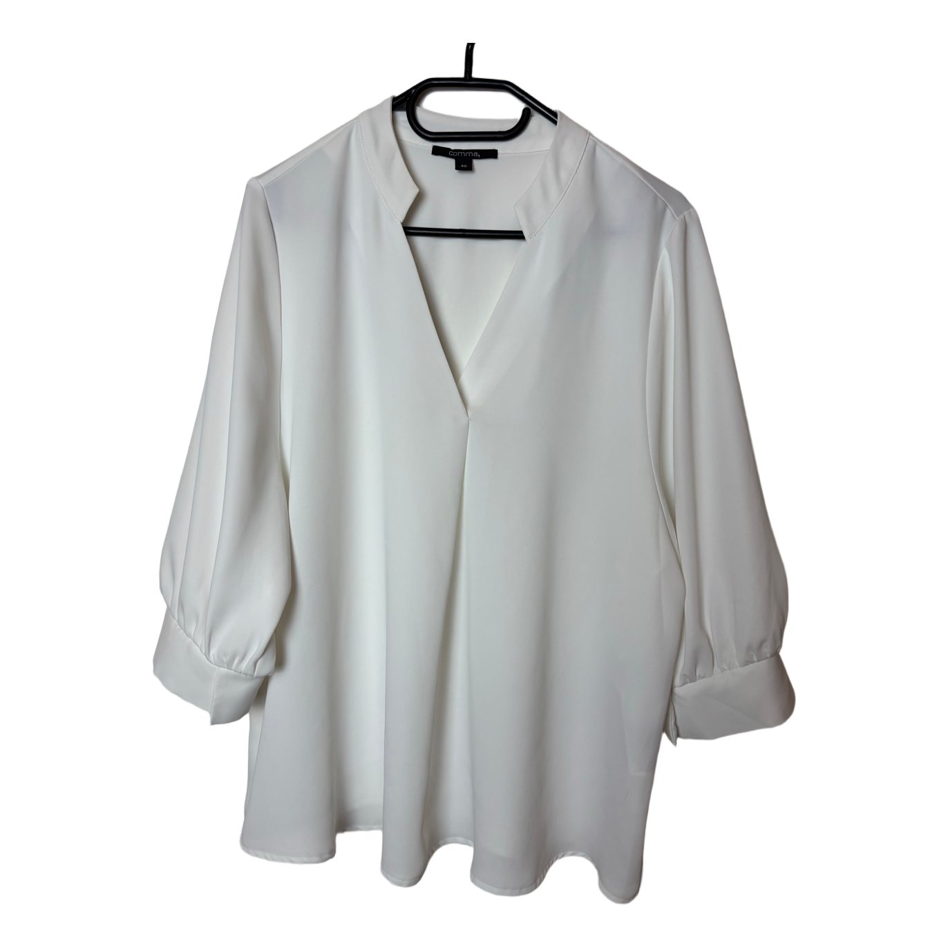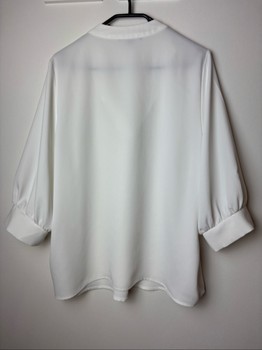 White blouse with a V-neck and three-quarter length sleeves with cuffs. Size 40.
