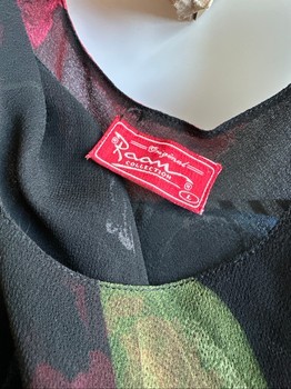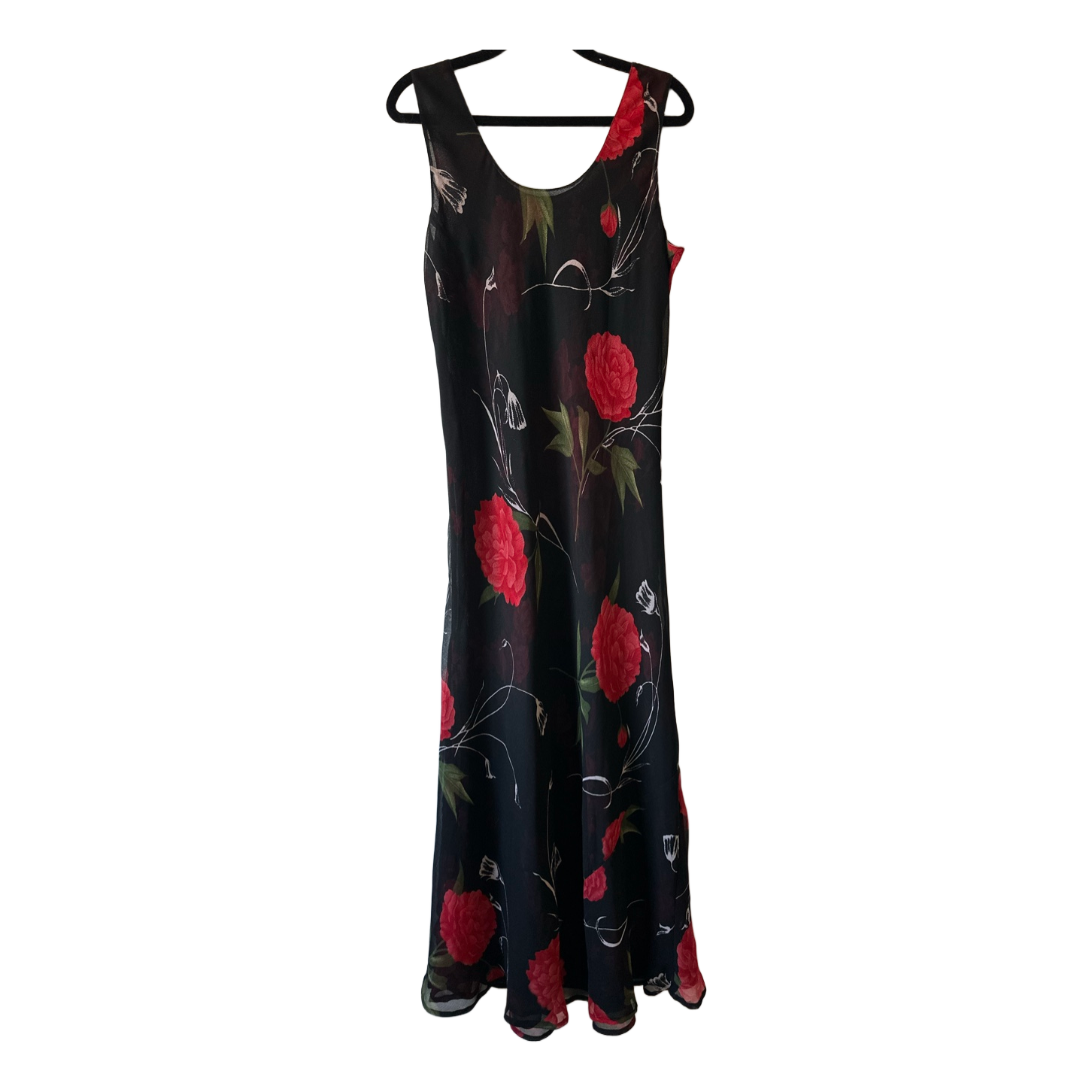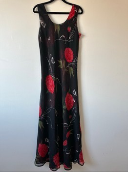 Sleeveless floral print maxi dress in black with red flowers. Size L.