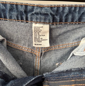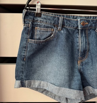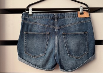 Blue denim shorts with a folded hem and five-pocket design. Size 40.