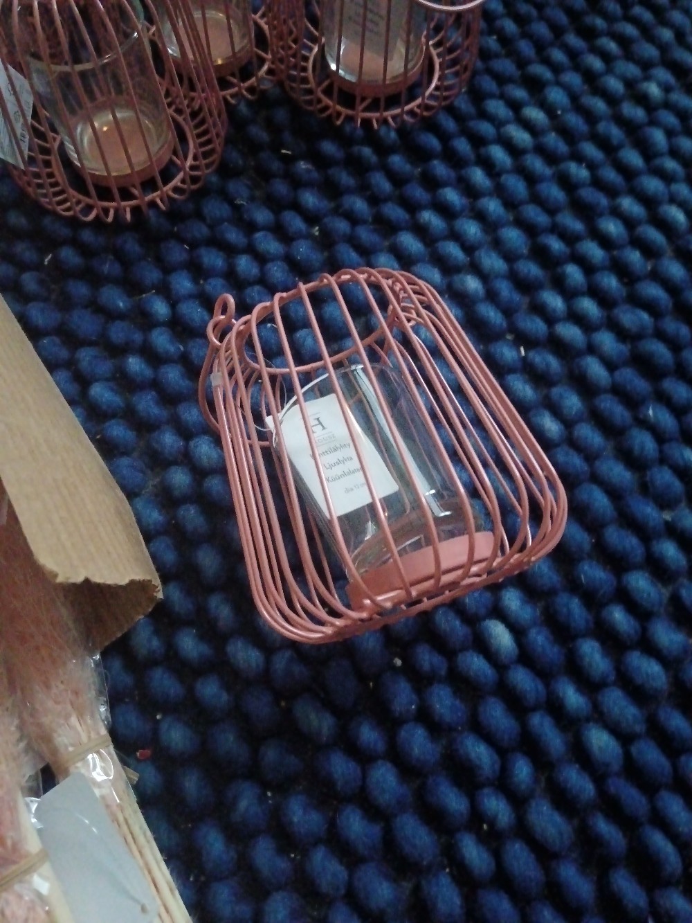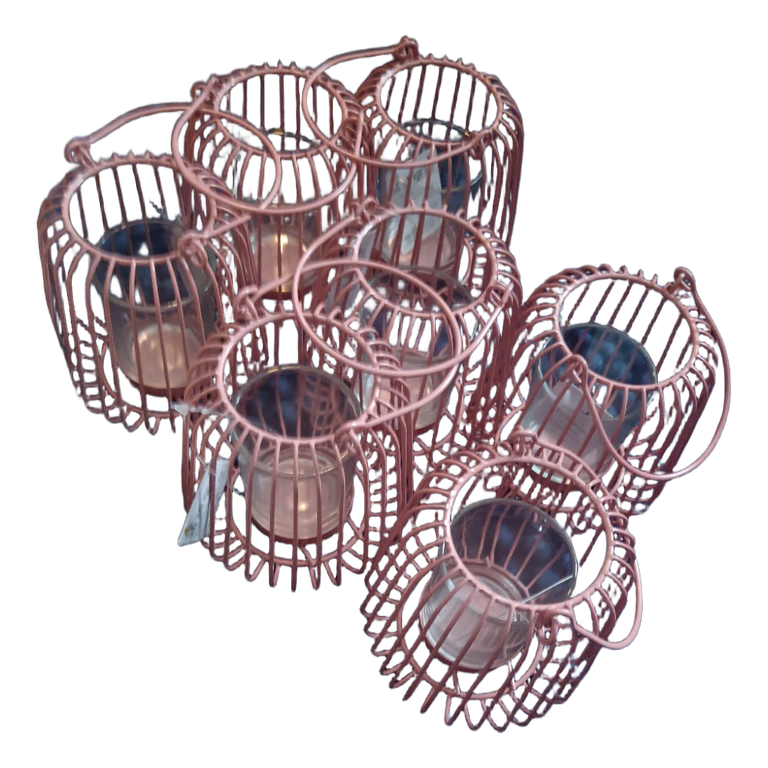 Light pink cage-like metal tealight lanterns with a glass inner part. Package contains multiple pieces.