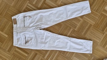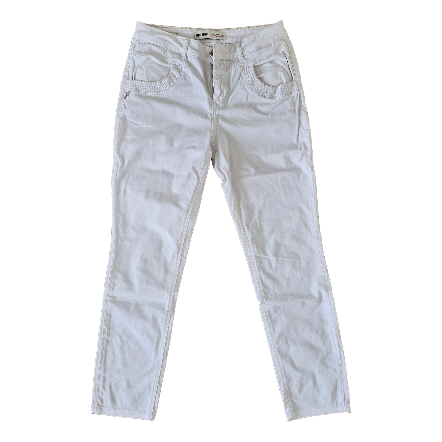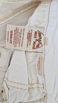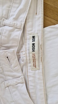 White Mos Mosh jeans. Material cotton and elastane. Neat and clean. Leg length from waist approx. 94 cm. Crotch height at the zipper 24 cm. Half waist measurement 37 cm. Slightly stretchy, not too much. Leg opening width 15 cm.