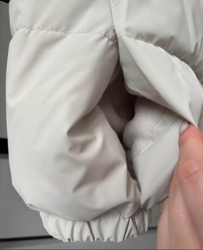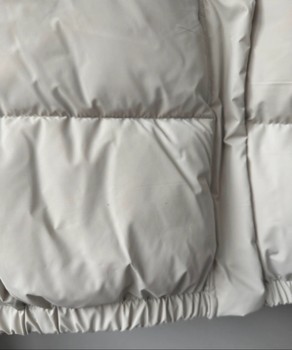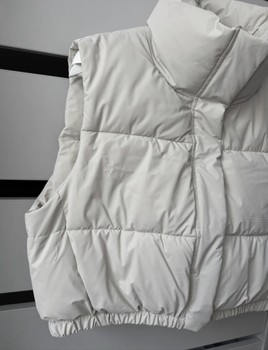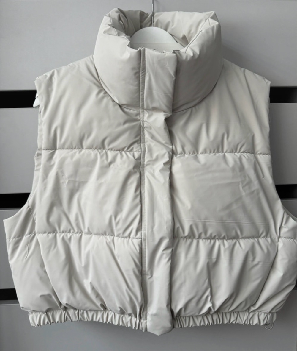 Beige padded vest with high collar and zipper. With elastic bottom. Size XXL, but I wear a smaller one and it looks great. There are mini dots, not visible.