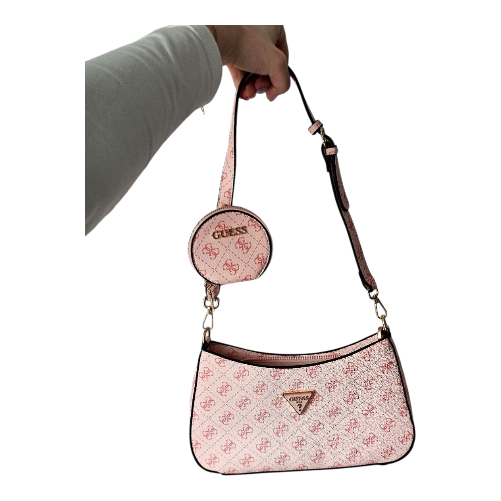 Pink Guess shoulder bag with a monogram pattern and a small detachable round coin purse. Features gold-toned hardware and a logo plaque.