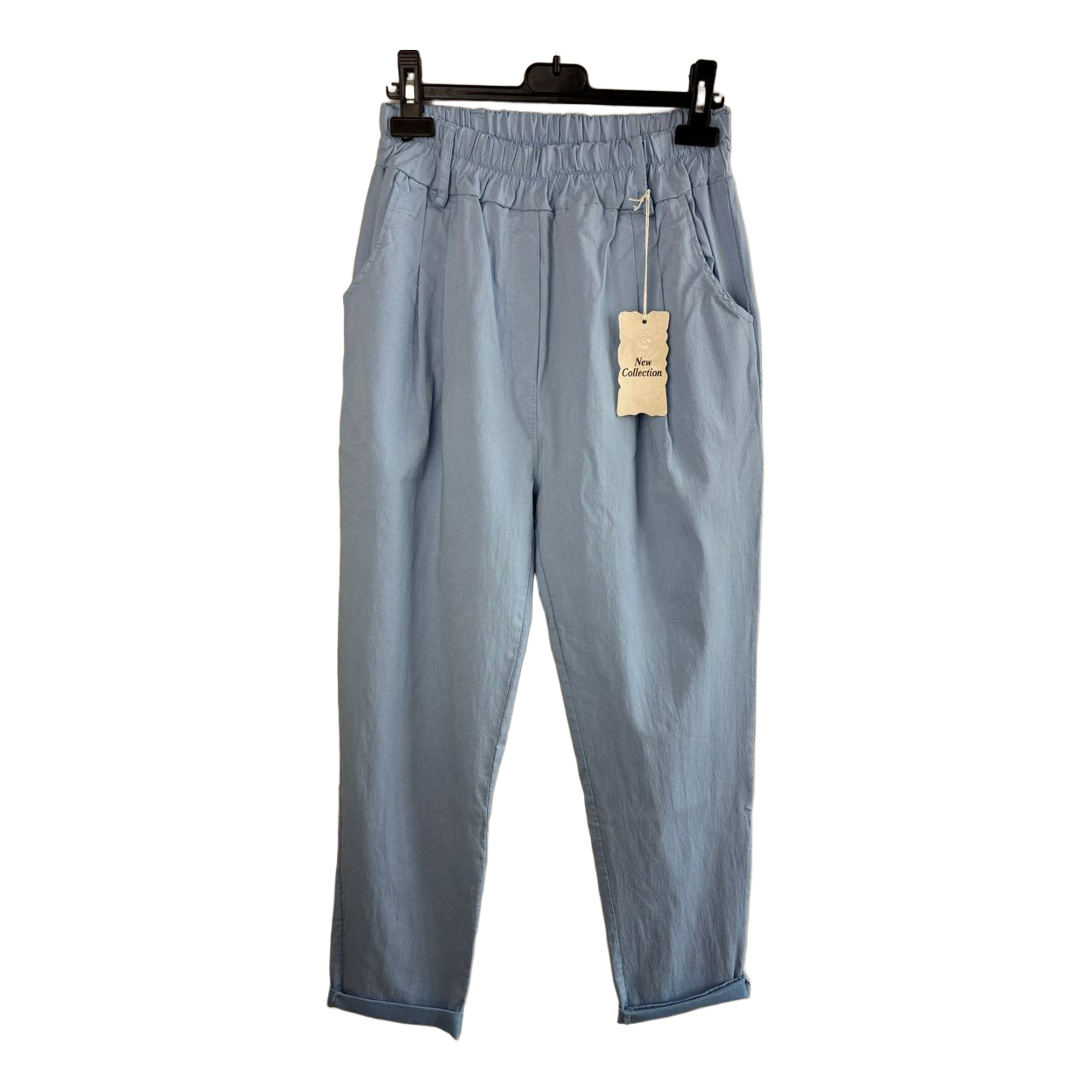Light blue casual trousers with an elasticized waistband. Features a relaxed fit with turned-up hems.