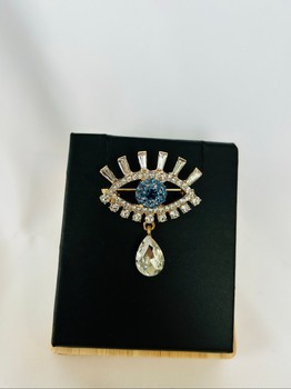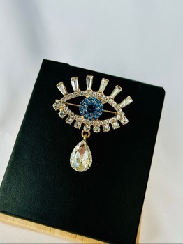 Gold-tone eye brooch featuring blue and clear crystal embellishments and a hanging teardrop pendant.