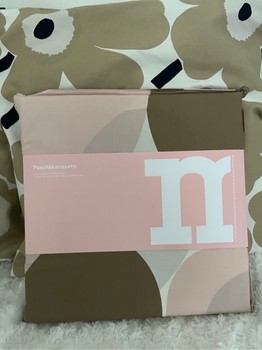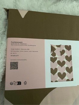 Marimekko Sydämet duvet cover 150×210 and pillowcase 50×60. Color: white, sand, light pink. 100% cotton. The top end of the duvet cover has corner openings that make changing sheets easier. New and unused, in its package.