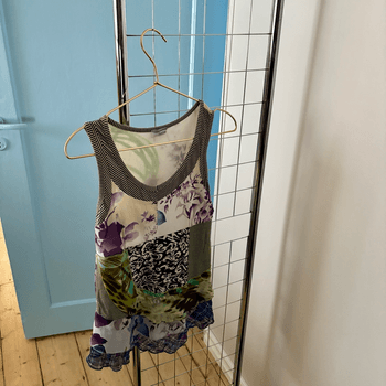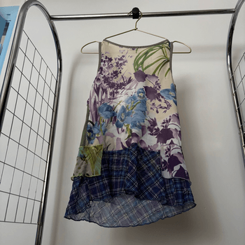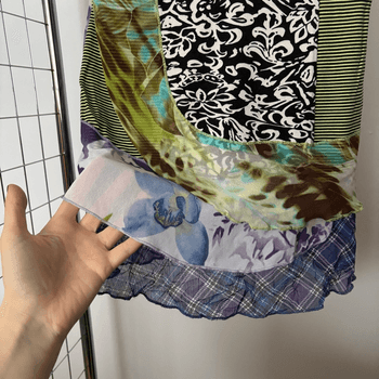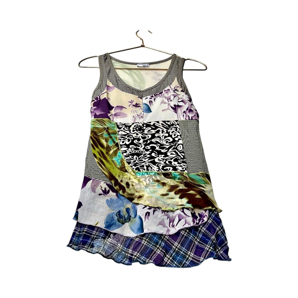 A sleeveless y2k top with varied floral, striped, and plaid patterns. Slightly stretchy material, but best fits S.
