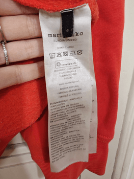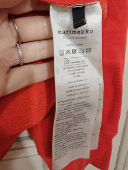 Marimekko Runoja red hoodie worn only a couple of times. Size generous S, has been worn by L/XL sizes, is a very oversized model. Underarm-to-underarm 60 cm, shoulder-to-hem 65 cm. Pickup Turku city center or shipping €8.80 Matkahuolto.