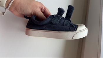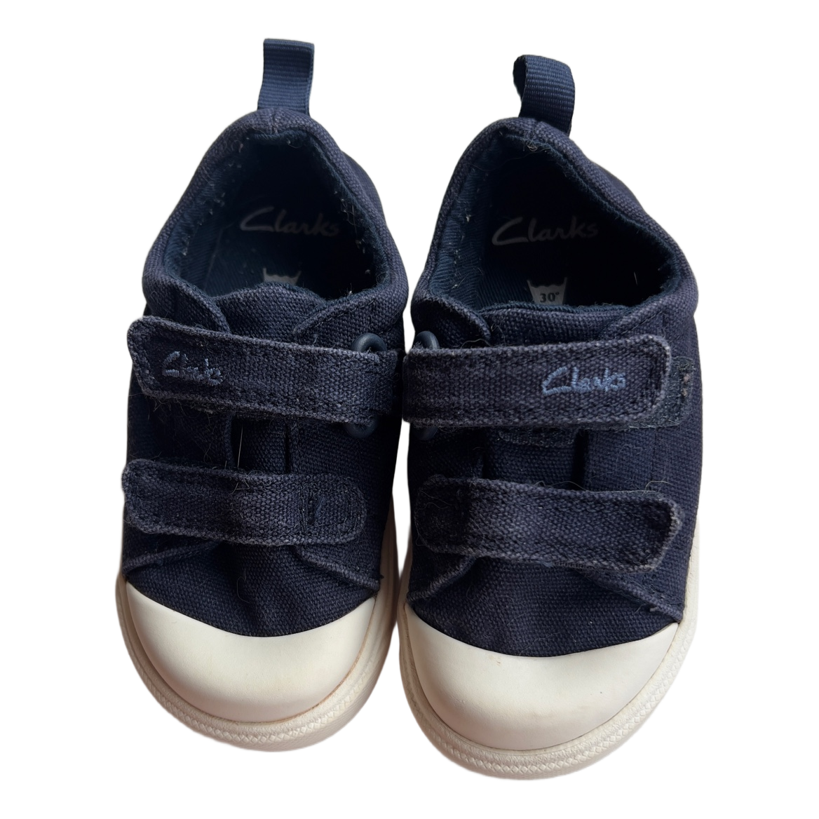 Navy canvas sneakers with double velcro straps and white rubber toe caps. Size 22.5.