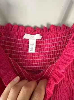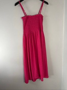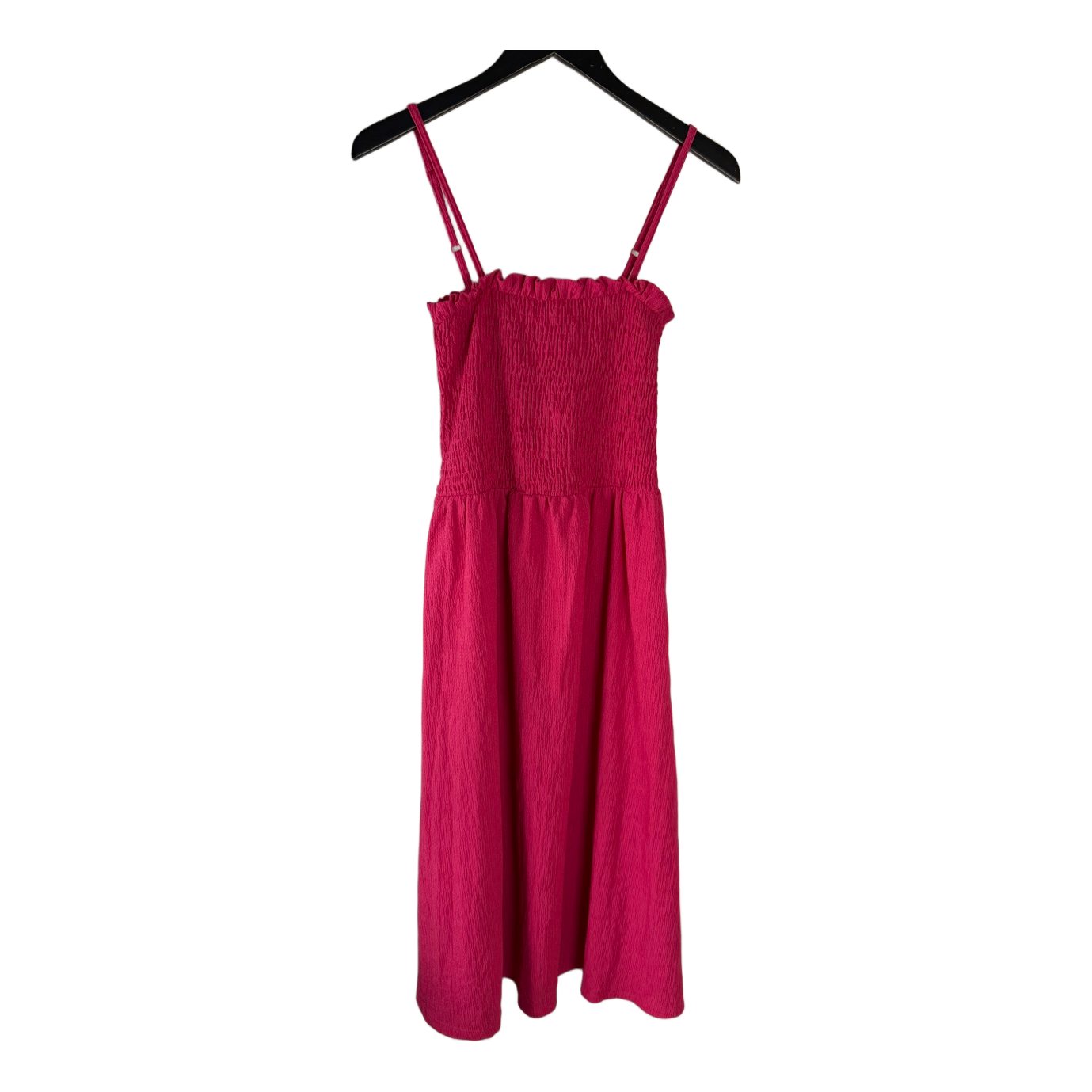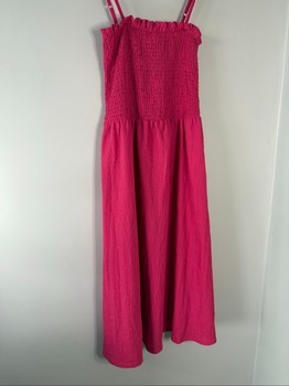 Midi dress in a vibrant pink color featuring a smocked bodice and adjustable thin straps. Size M.