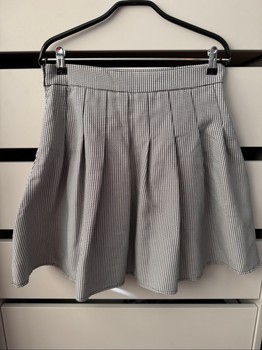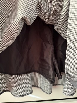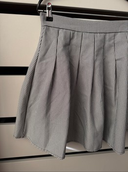Mini skirt with a houndstooth pattern in black and white. Features a pleated design and a side zipper closure. Size L.