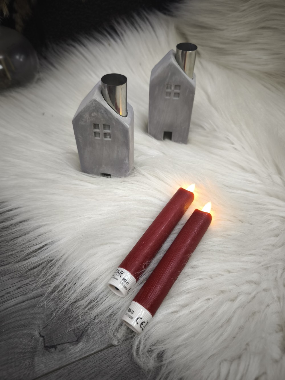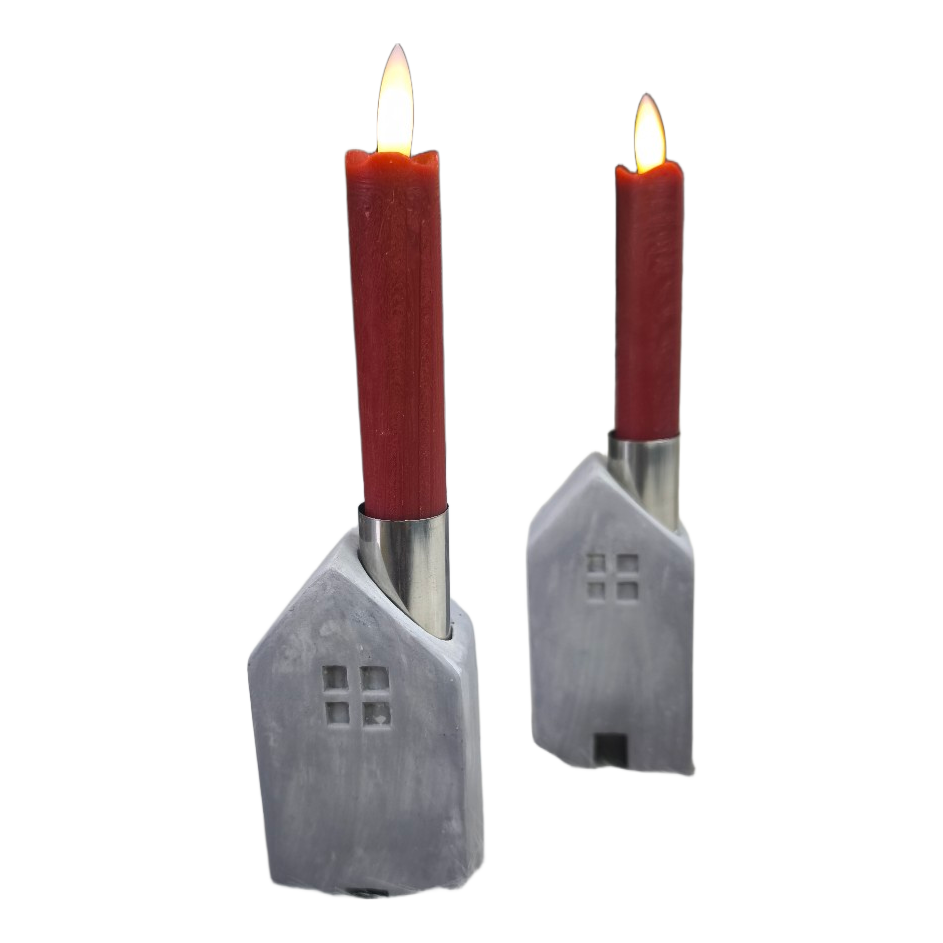 Dvi namelių formos žvakidės, parduodamos be žvakių.