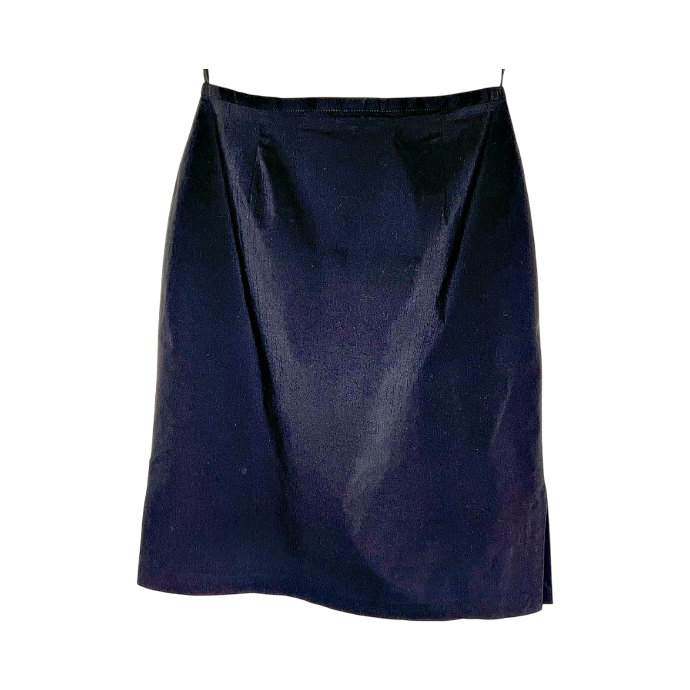 Like-new black narrow skirt, size 44. Outer fabric 68% viscose 27% polyamide 5% elastane, lining 100% polyester. Wash 40C. Length 61 cm, waist width 41 cm (note: no stretch), hip width 53 cm (stretches max to 58 cm), hem width 53 cm. Back 21 cm zipper. Side seams 16.5 cm slits.