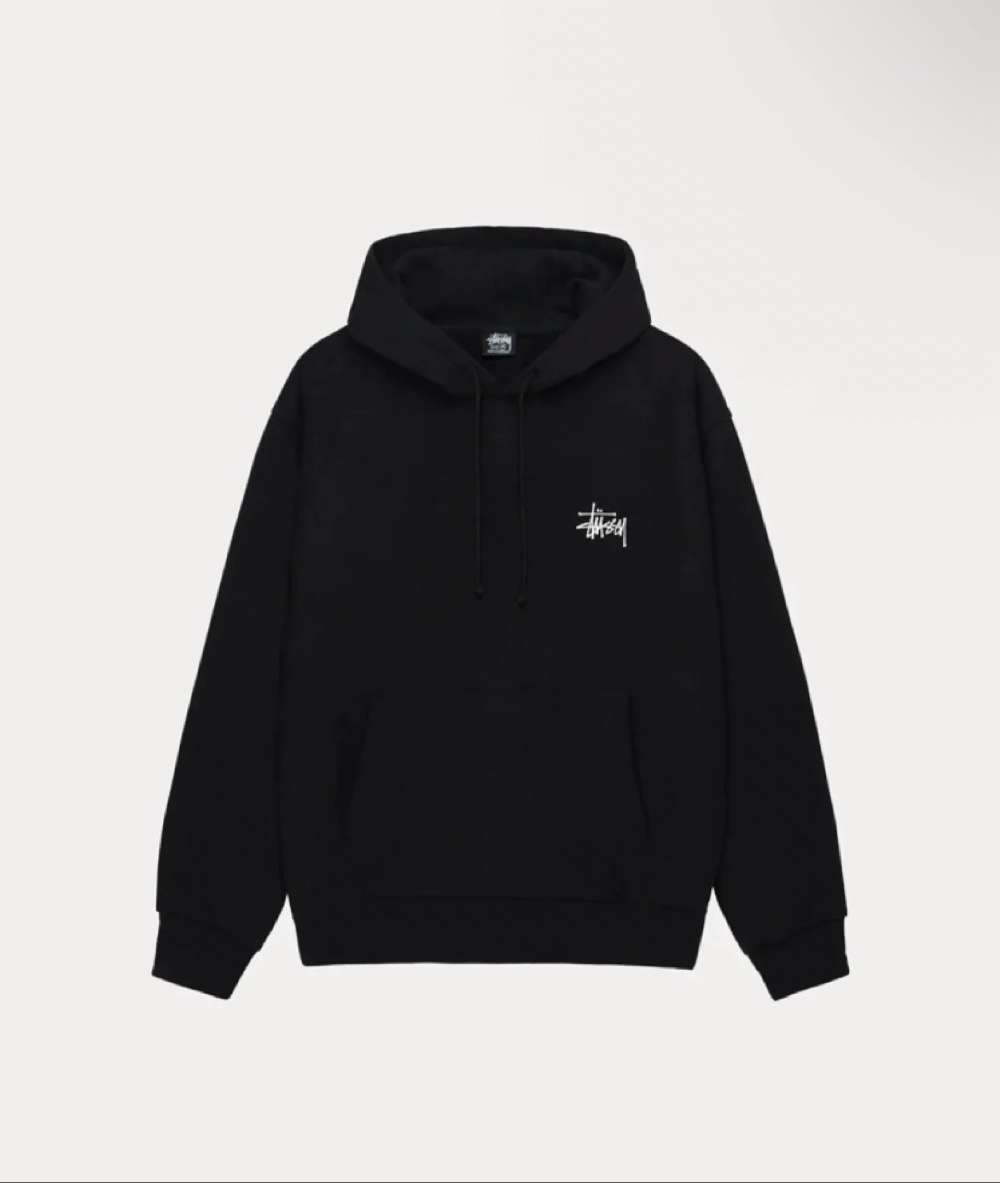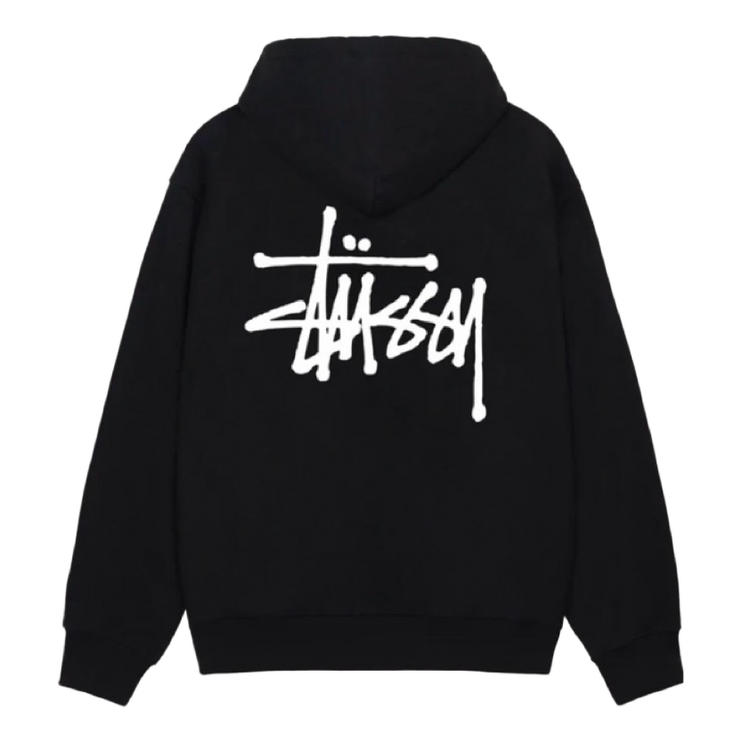 Black Stussy hoodie, with white logo on the front and back. Hooded model.
