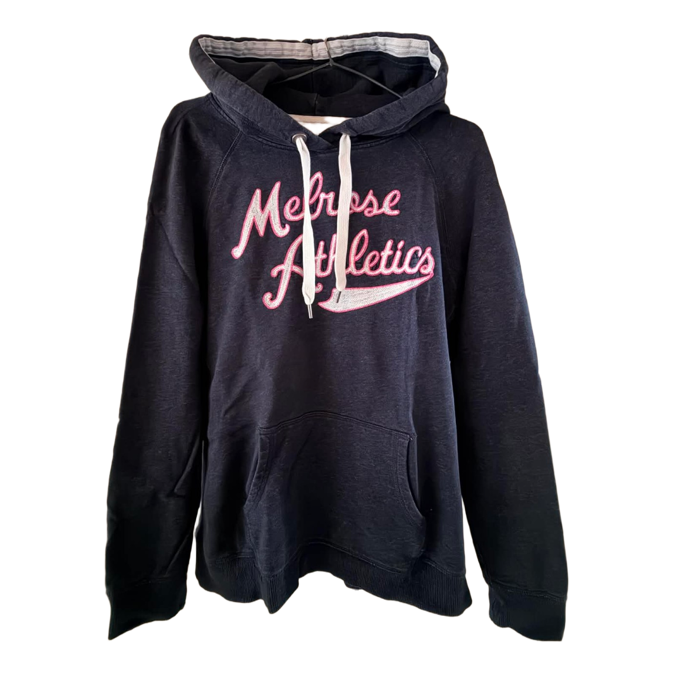 Navy hoodie featuring a pink graphic print on the front and white drawstrings. Includes a kangaroo pocket.