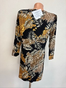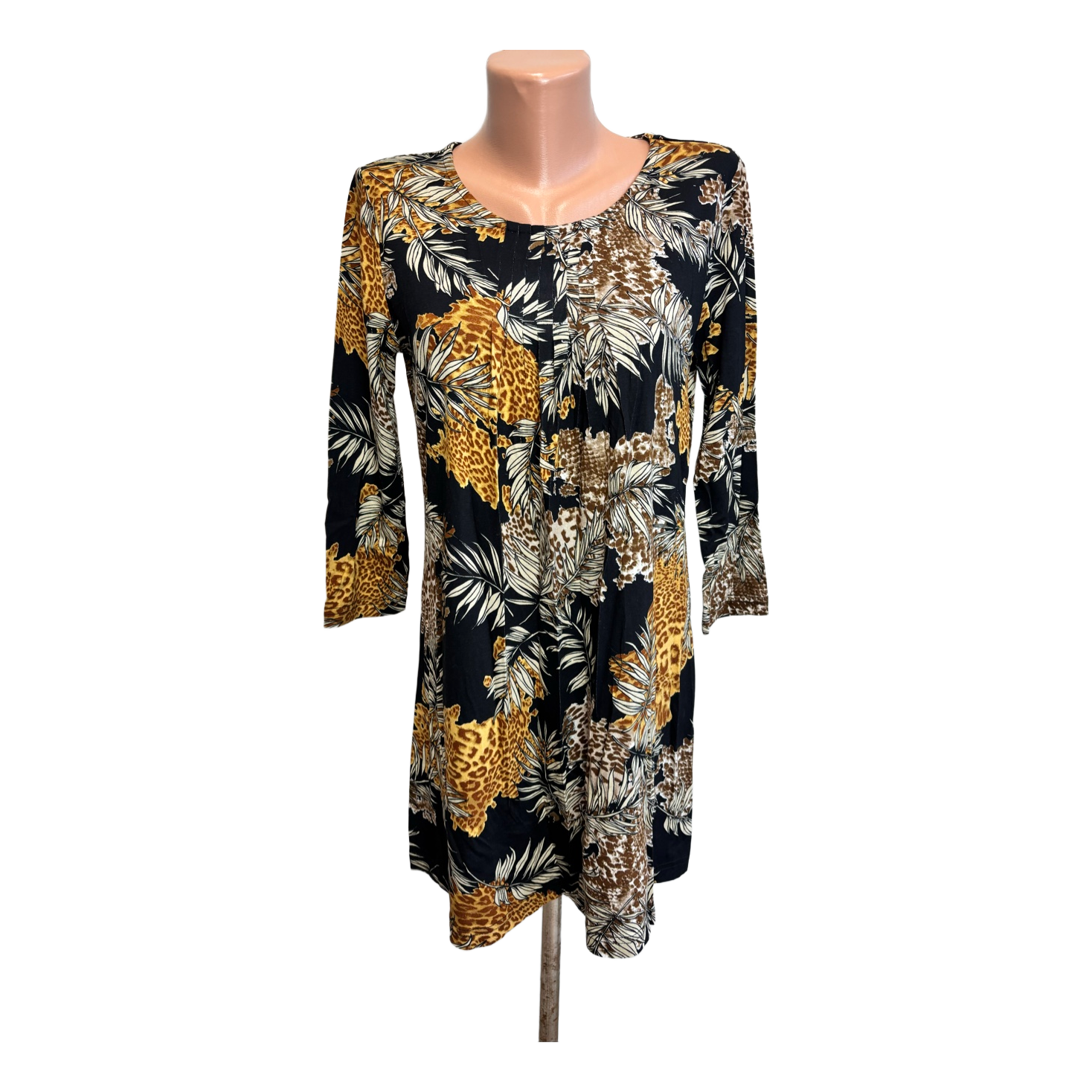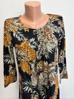 Black long-sleeved tunic with an animal and leaf print. Includes a gathered neckline detail. Made of viscose and elastane. Size 38.