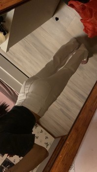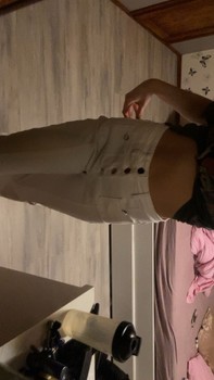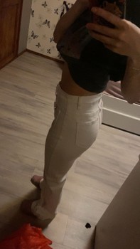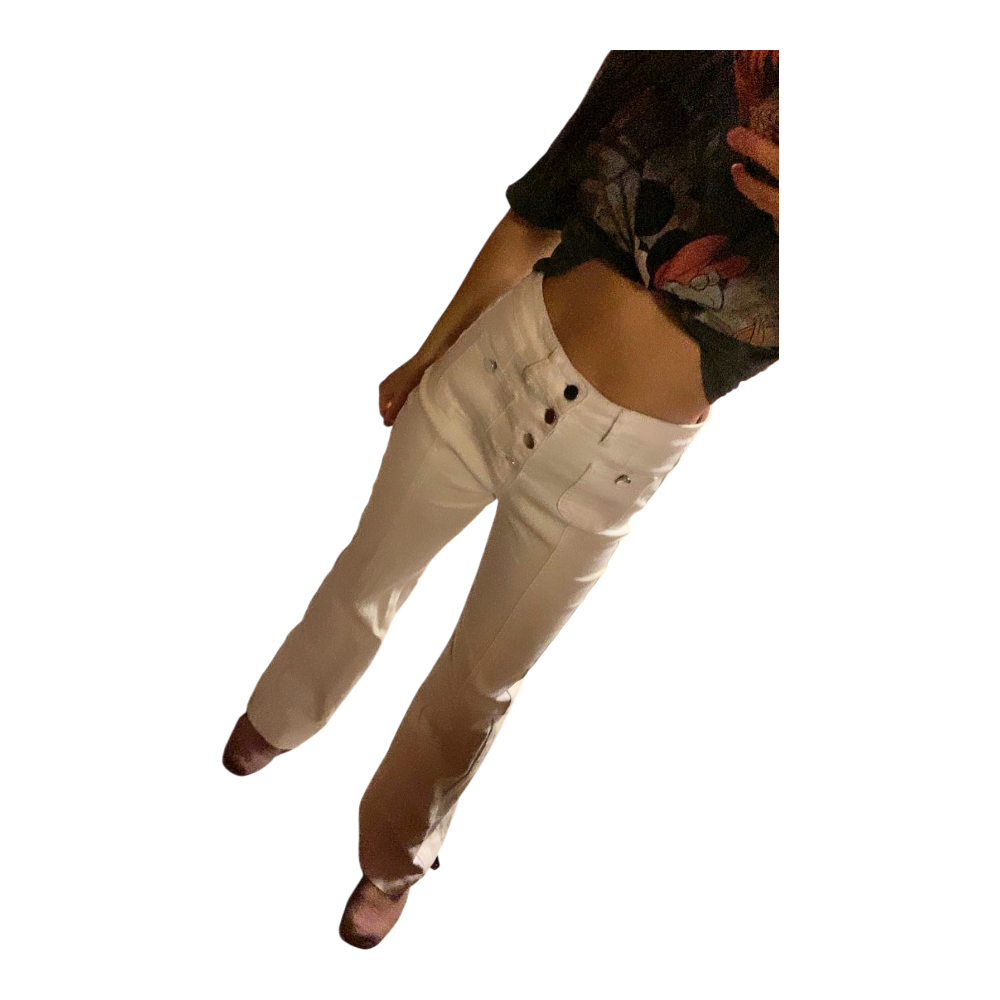 White, high-waisted pants. Button details at the front.