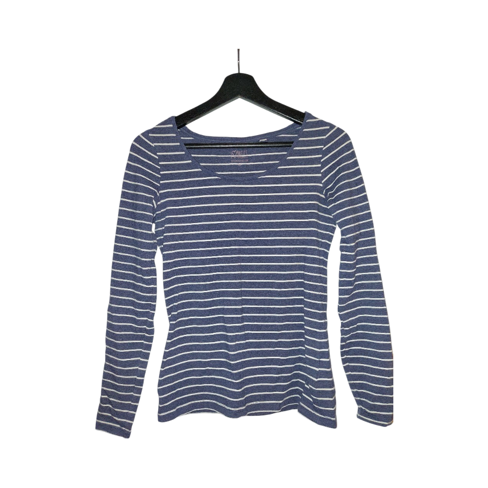 Navy and white striped long-sleeve casual top, lightweight.