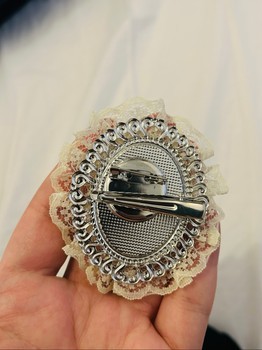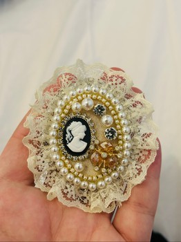Decorative brooch featuring a vintage-style cameo, faux pearls, and delicate lace trim. Perfect for adding a classic touch to any blazer or jacket.