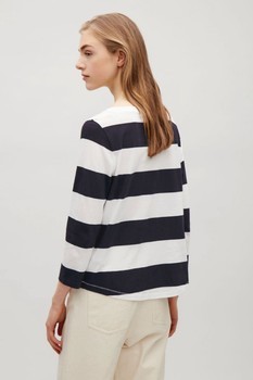 COS, striped top, boxy fit, minimalist, Scandinavian style, navy, white, casual, women’s top, oversized, basic, cotton, everyday wear, timeless, classic