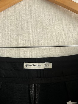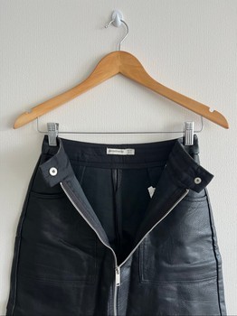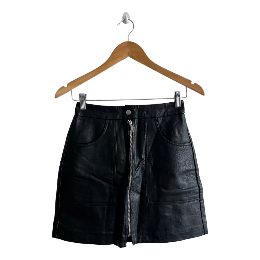Black skirt with front zip closure and pockets. Made of faux leather. Size 34.
