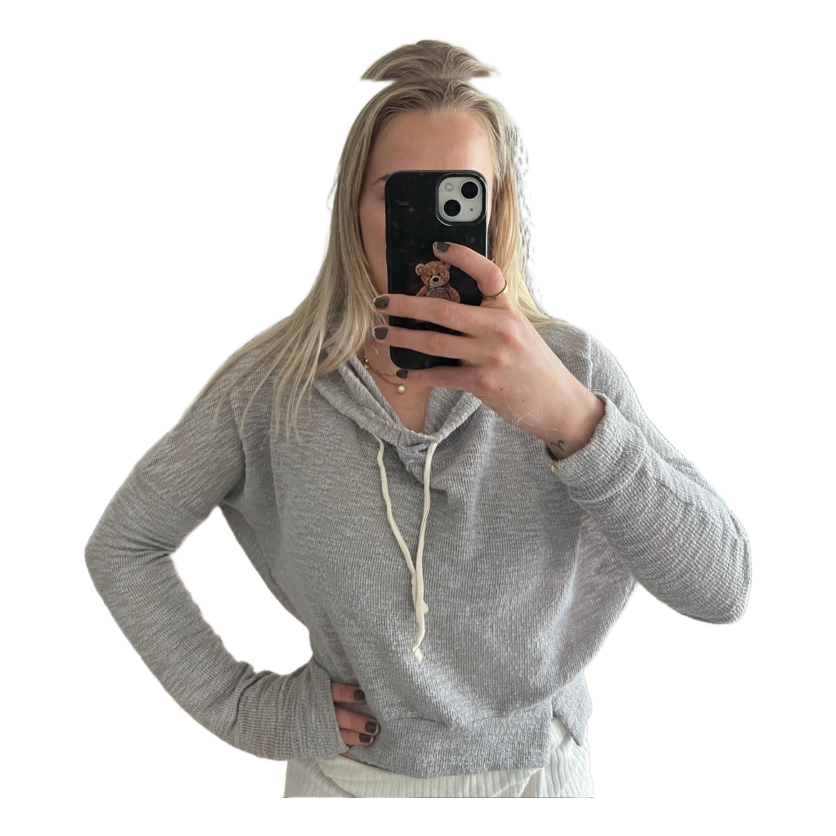 Gray long-sleeved hoodie with drawstrings at the neckline. Lightweight and relaxed style.