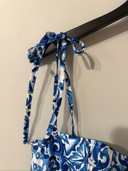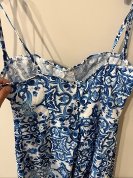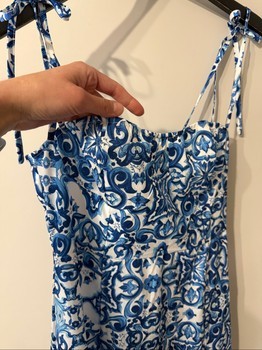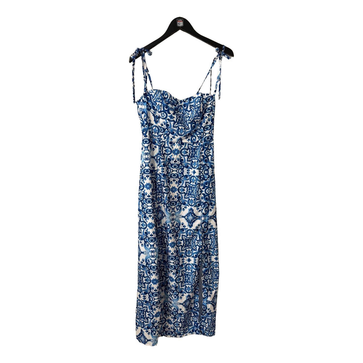 Midi dress featuring a blue and white tile-inspired pattern. Design includes tie-shoulder straps and a front slit. Material consists of 97% polyester and 3% elastane. Size M.